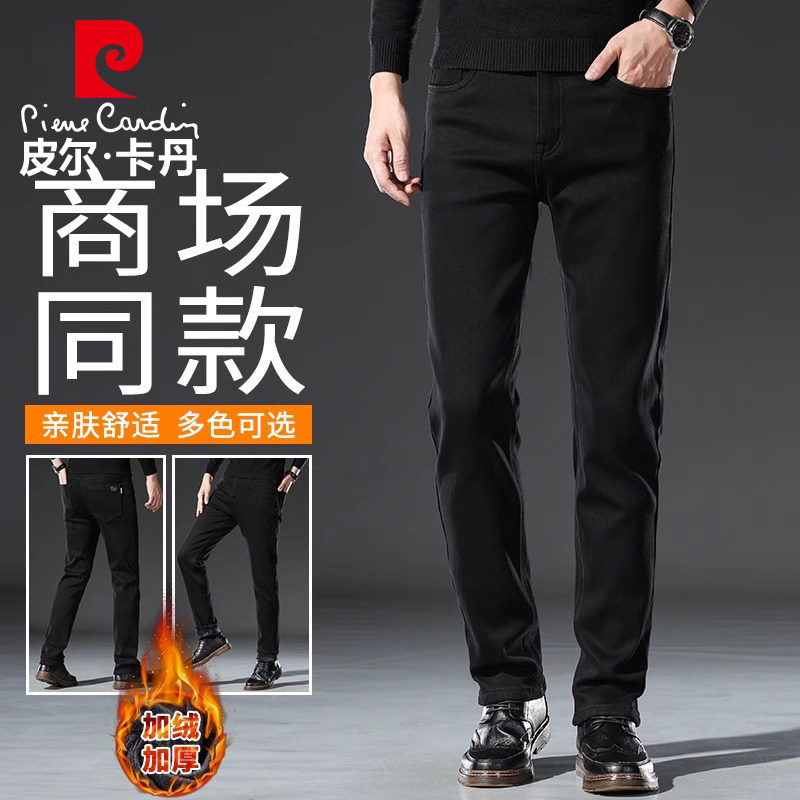 皮尔卡丹黑色牛仔裤男士2025加绒加厚款宽松直筒秋冬季保暖长裤子