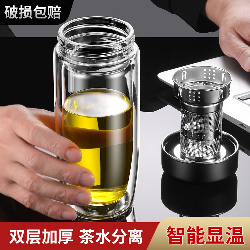 智能显温双层鹅蛋玻璃杯办公室专用泡茶杯隔热防烫茶水分离车载杯