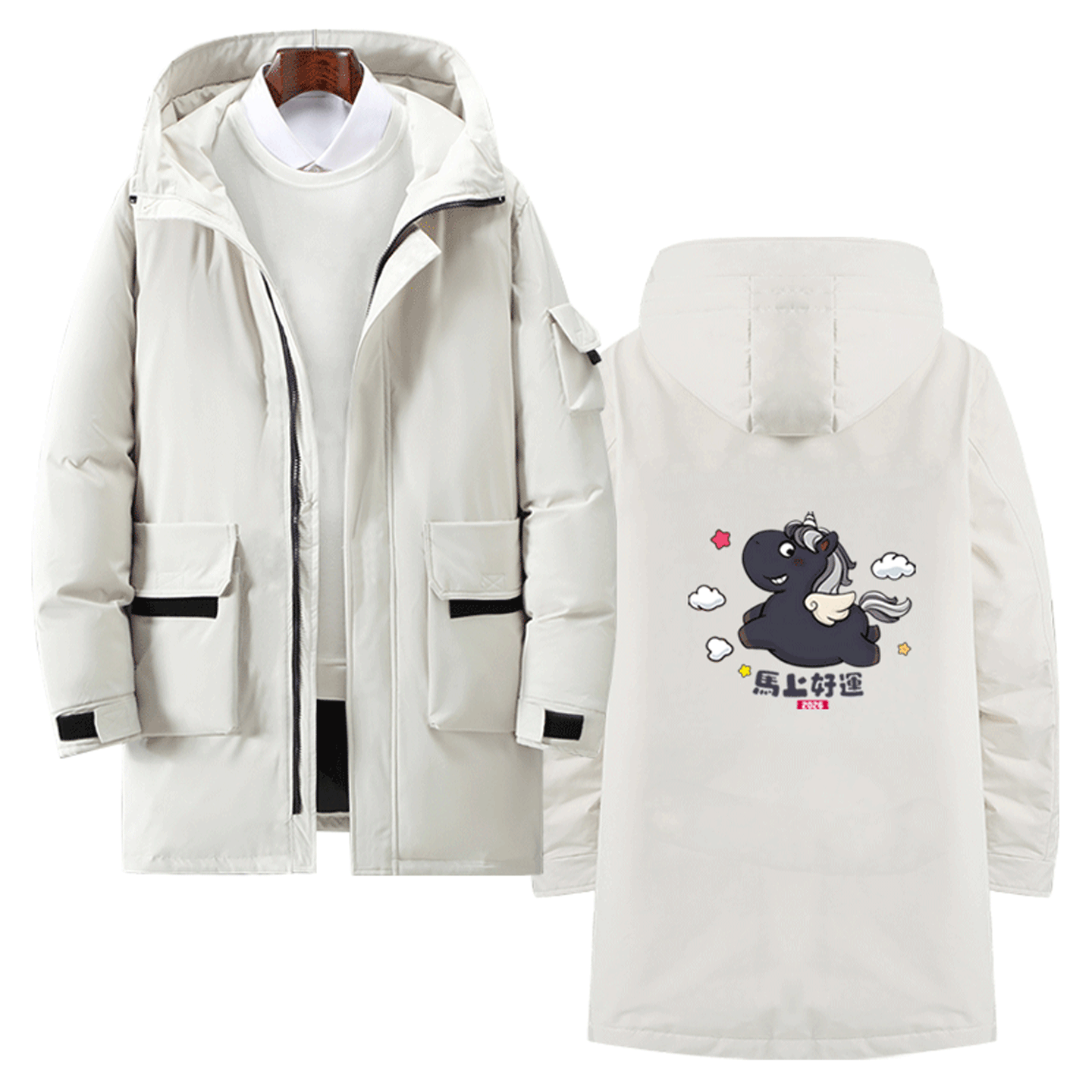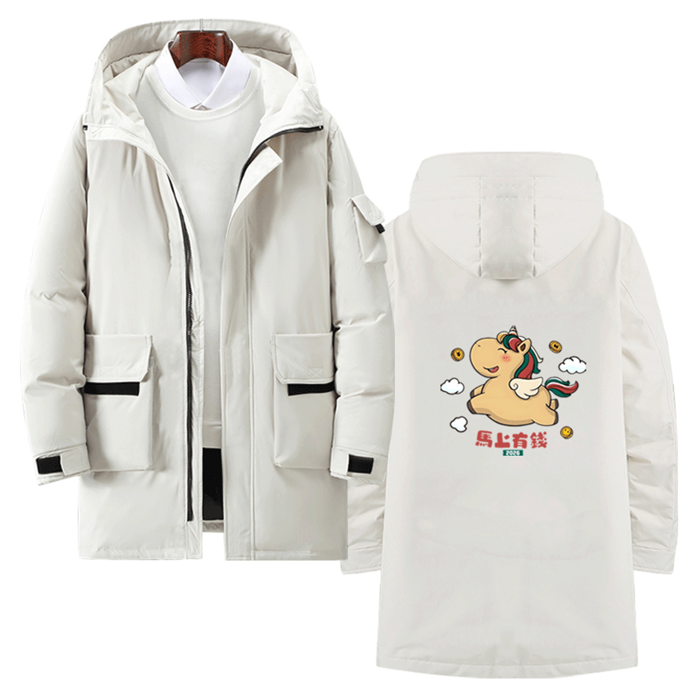 2026马年新年本命年定制中长款羽绒服男女情侣全家福马上有钱卡通