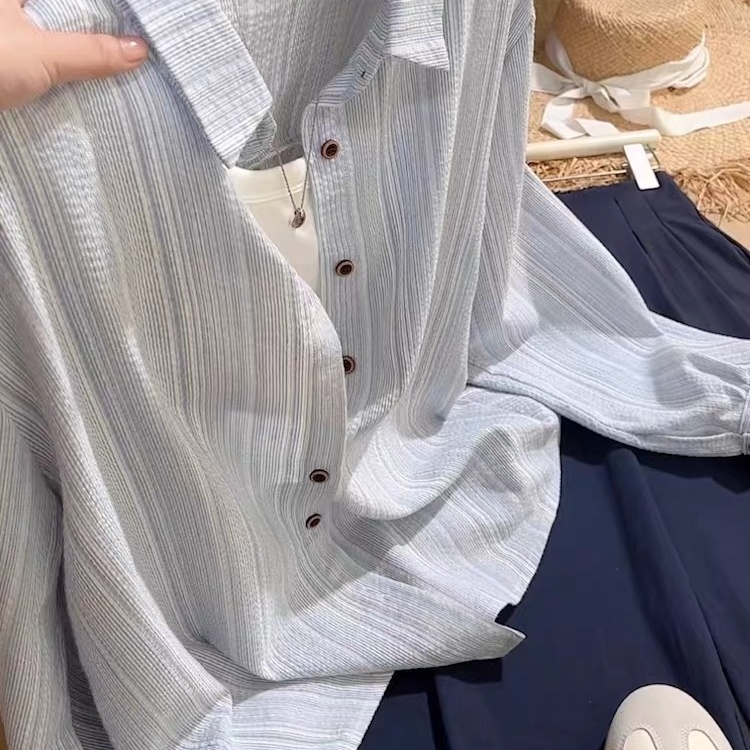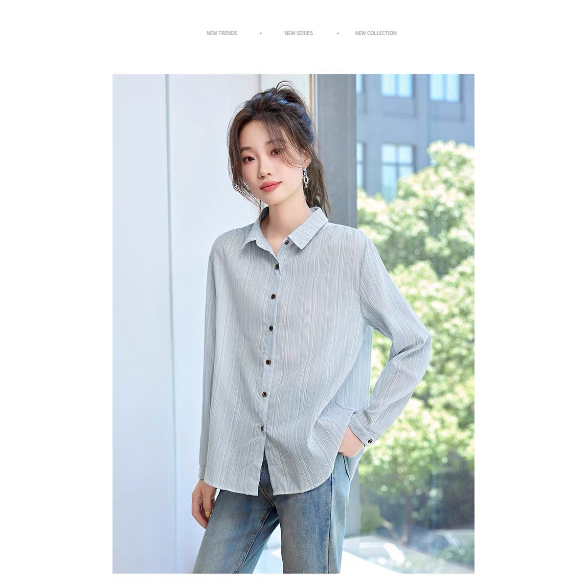 【棉麻优质版】蓝色竖条纹衬衫宽松休闲上衣秋装翻领洋气长袖衬衣