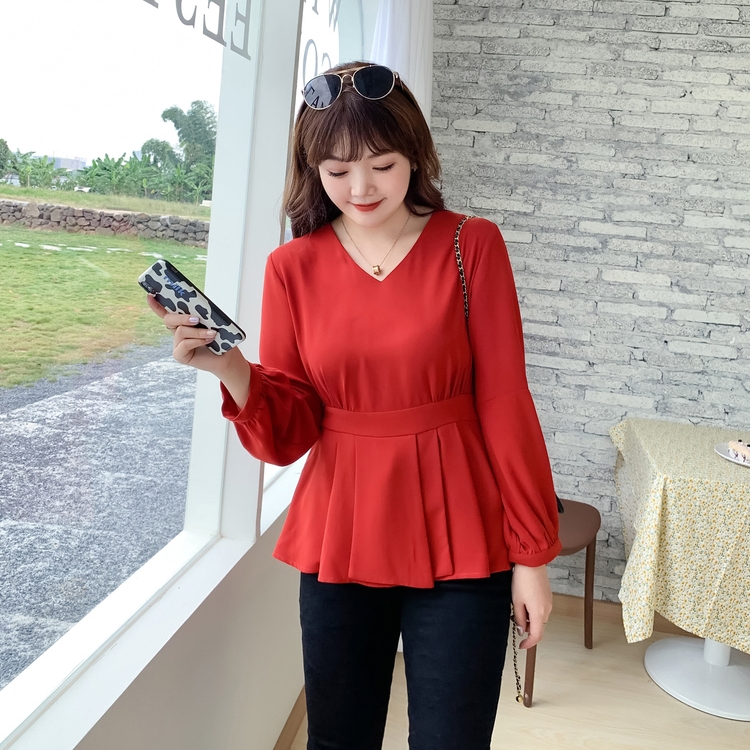 绮娑大码显瘦胖MM上衣女秋装新款气质百褶收腰遮肚子长袖V领小衫