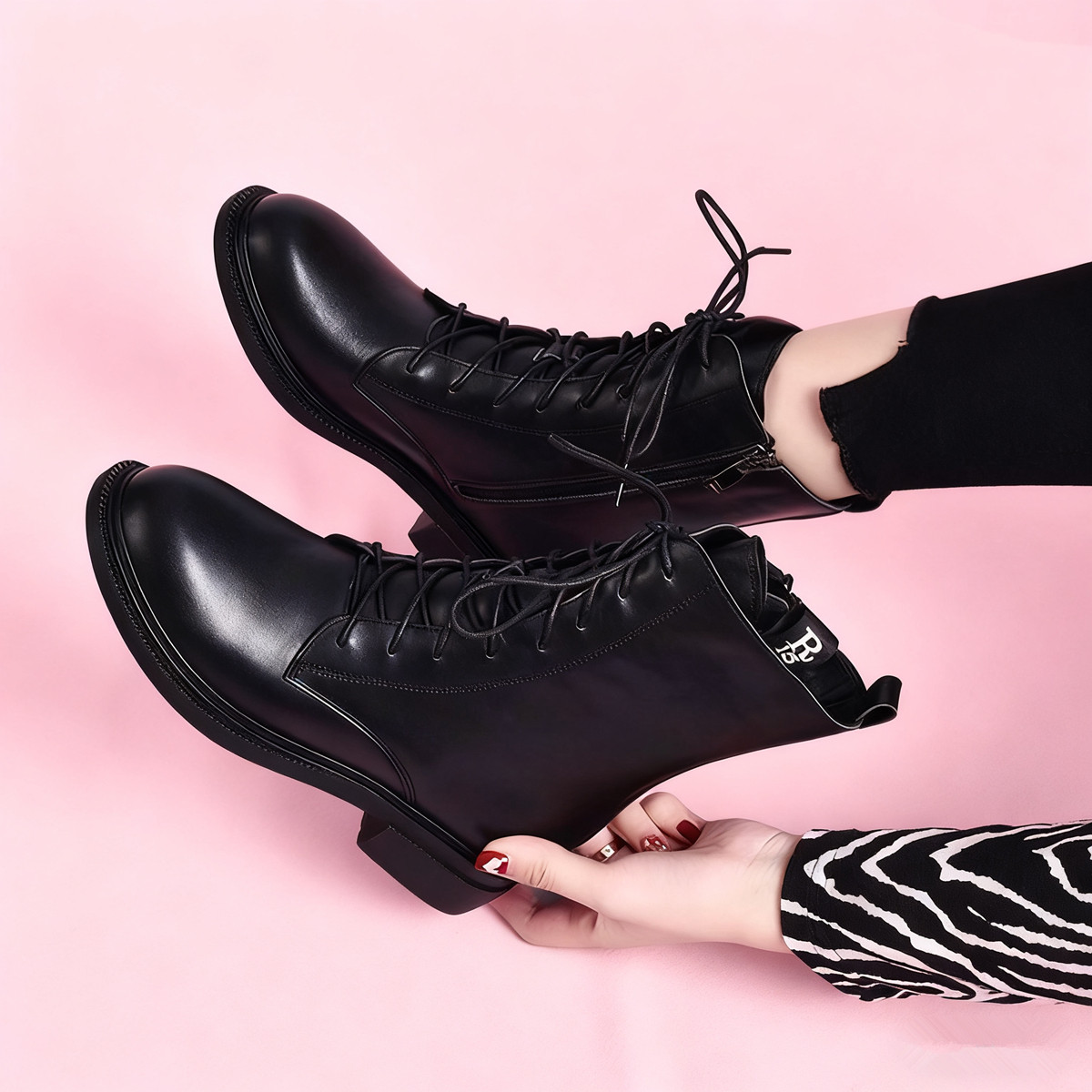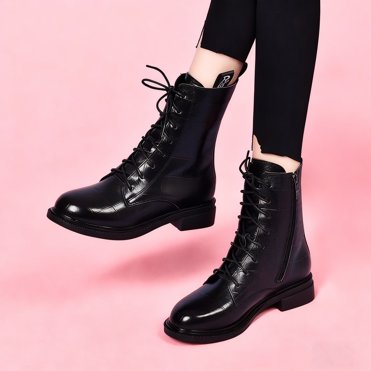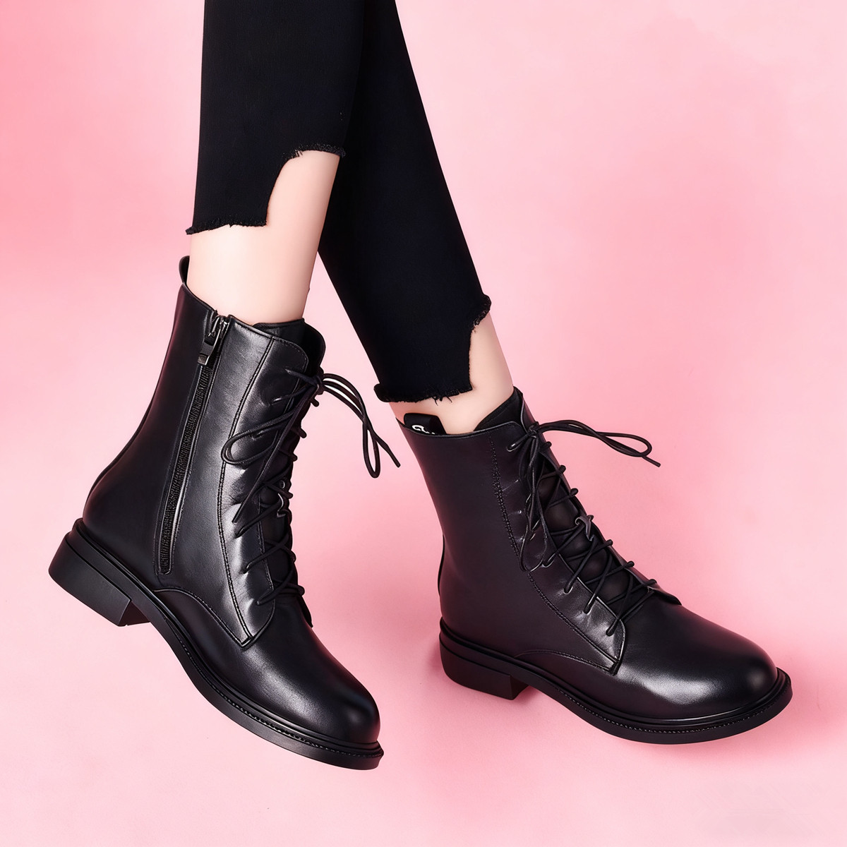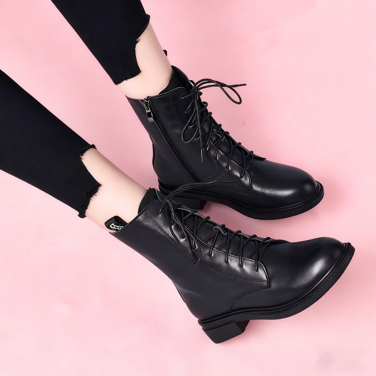 粗跟圆头系带中筒靴真皮马丁靴