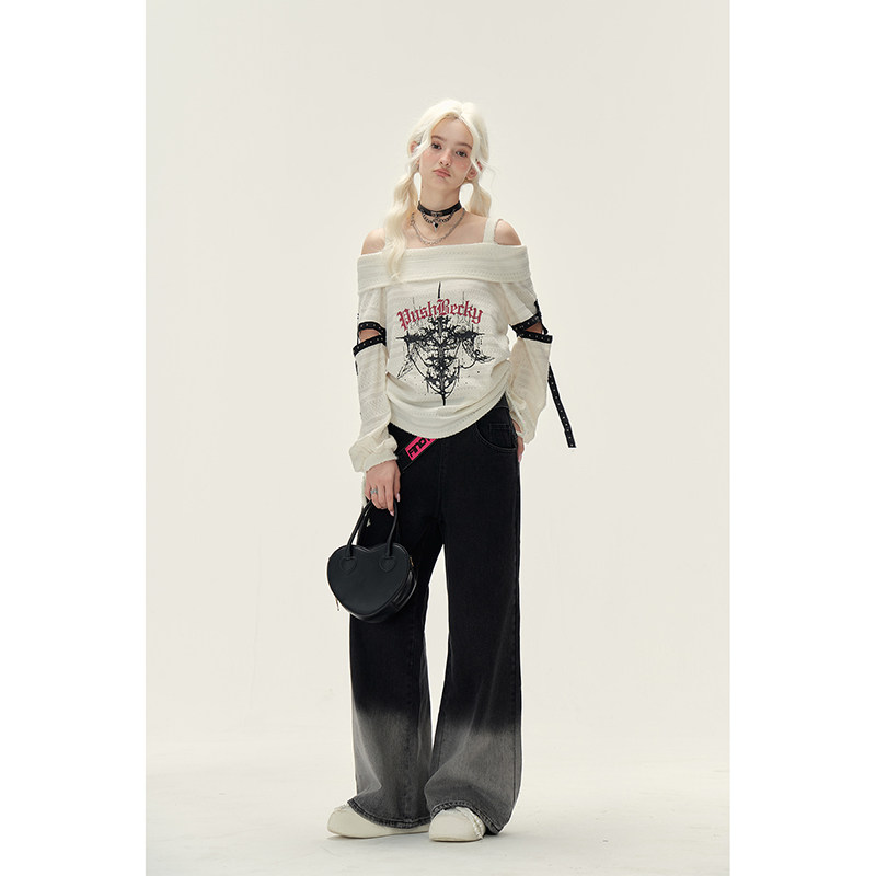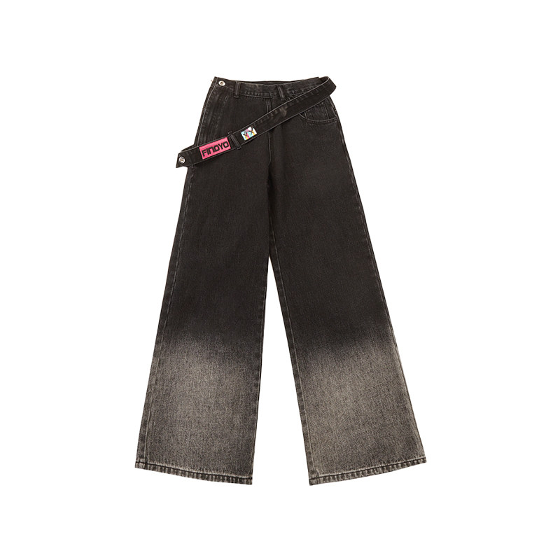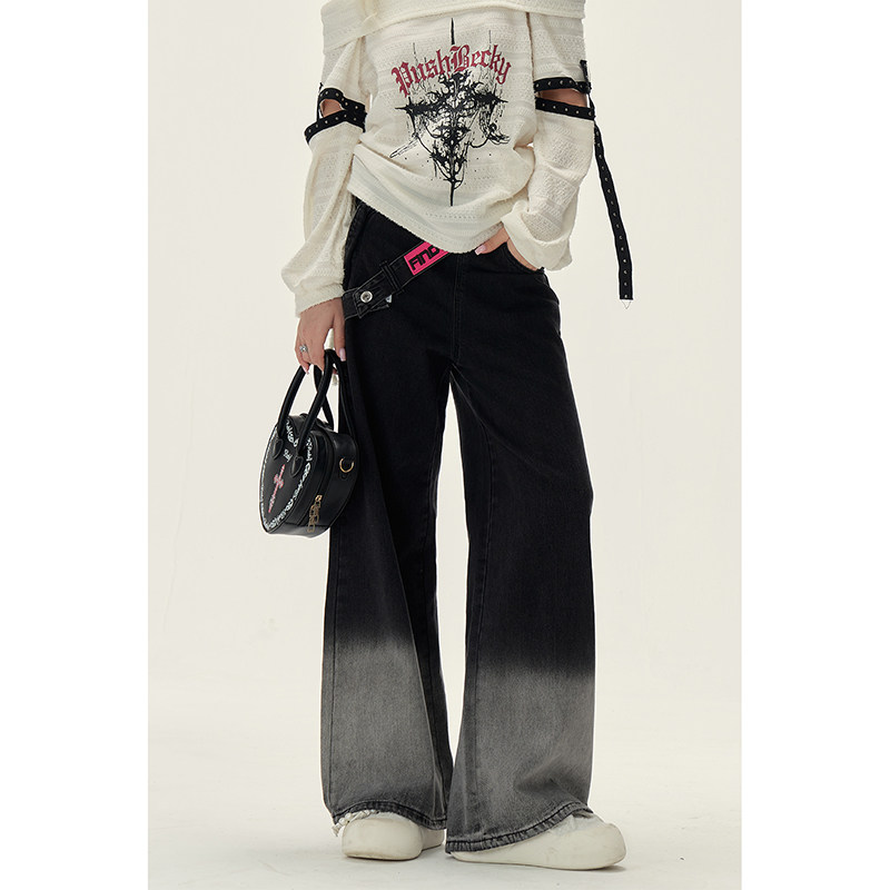 自然涩黑色侧拉链渐变阔腿牛仔裤女夏季宽松直筒阔腿春秋薄款裤子