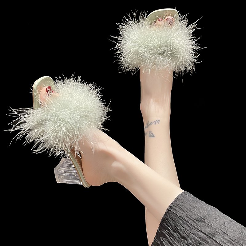 毛毛拖鞋女夏季新款外穿仙女风水晶高跟凉拖鞋一字晨袍拖鞋婚纱鞋