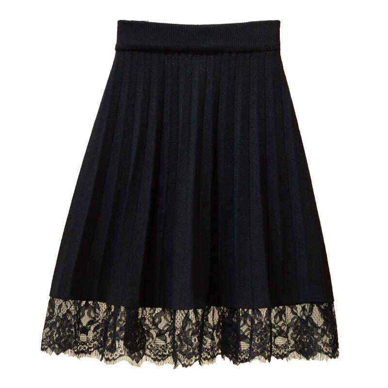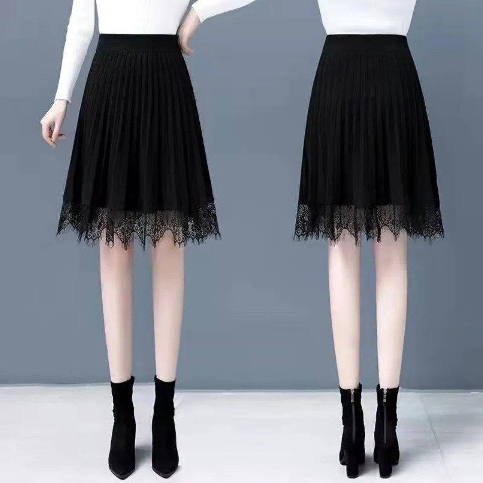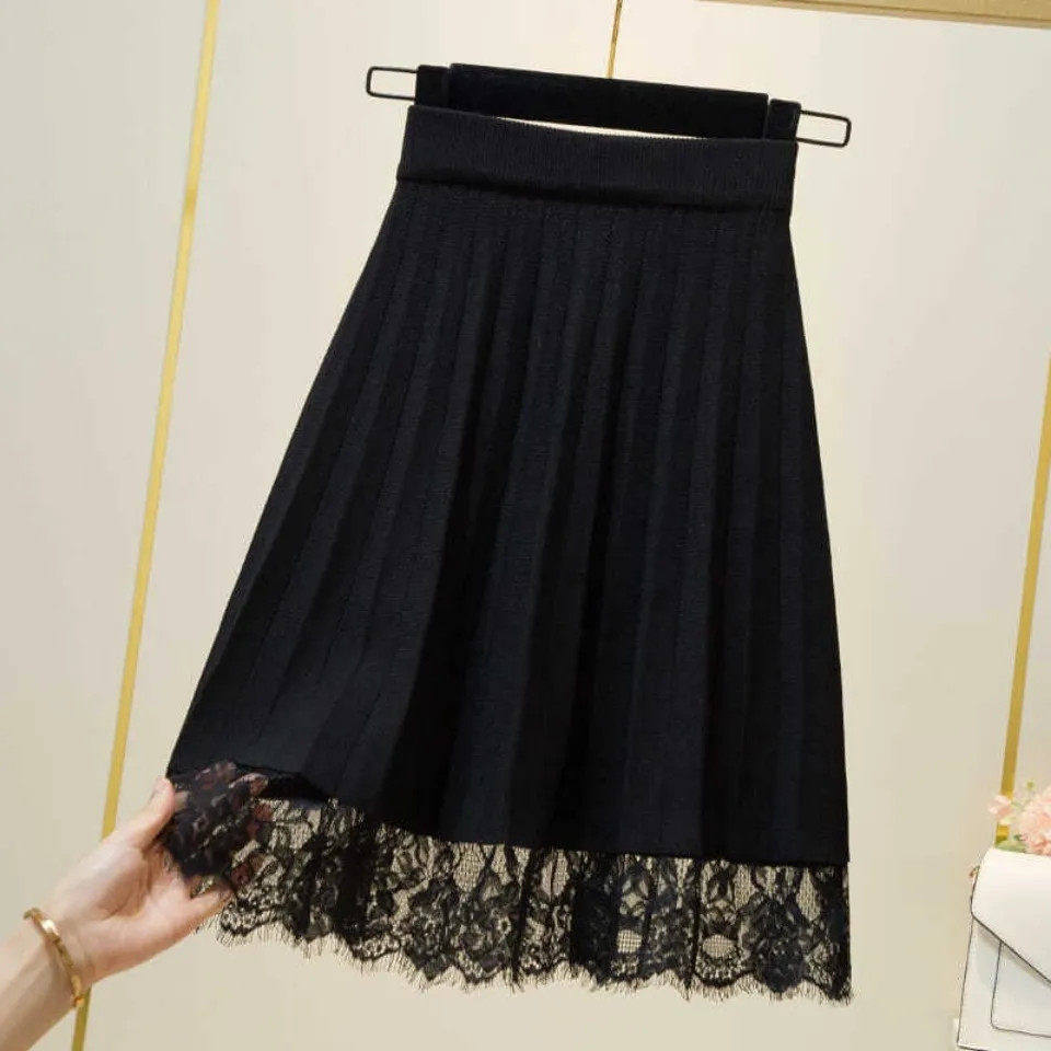 针织半身裙女a型2026春季新款高腰蕾丝花边拼接百褶裙毛线短裙潮
