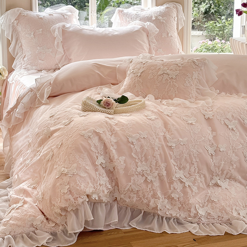 法式少女心全棉水洗棉四件套蝴蝶蕾丝边被套床单床裙纯棉床品粉色