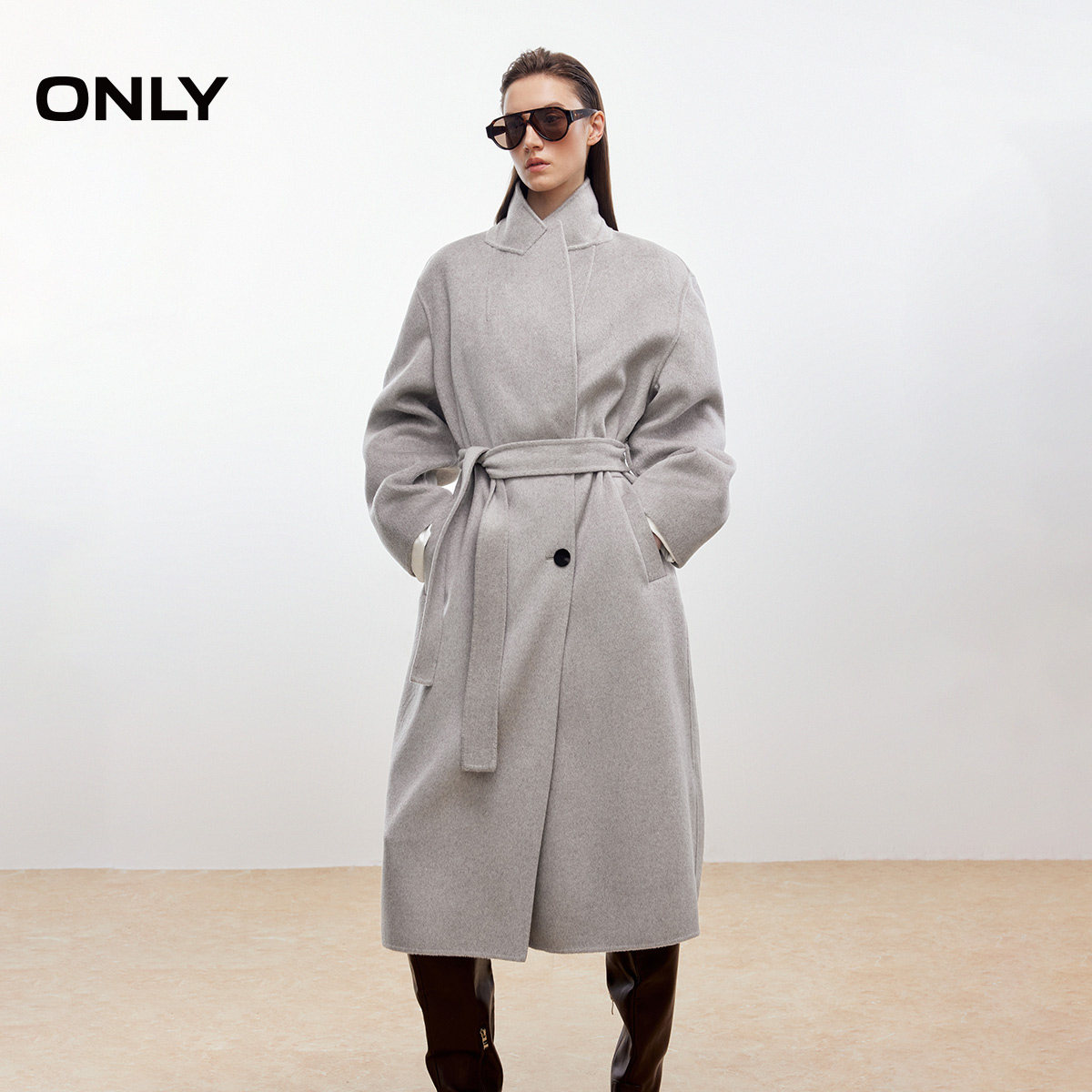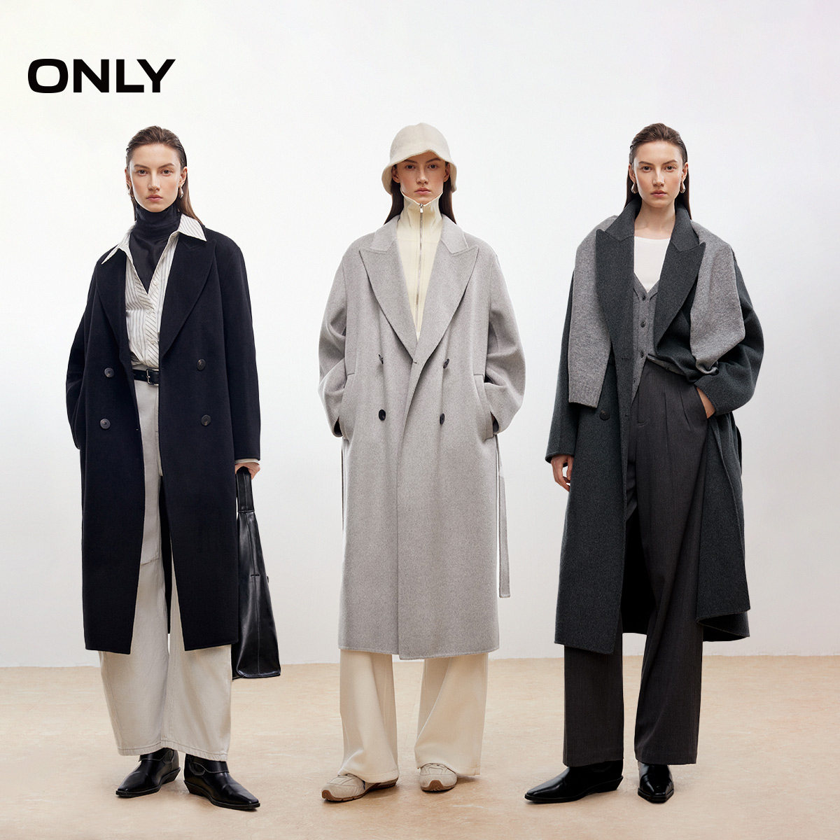 ONLY2025冬季新款100%绵羊毛双面呢纯色双排扣长款毛呢大衣外套女