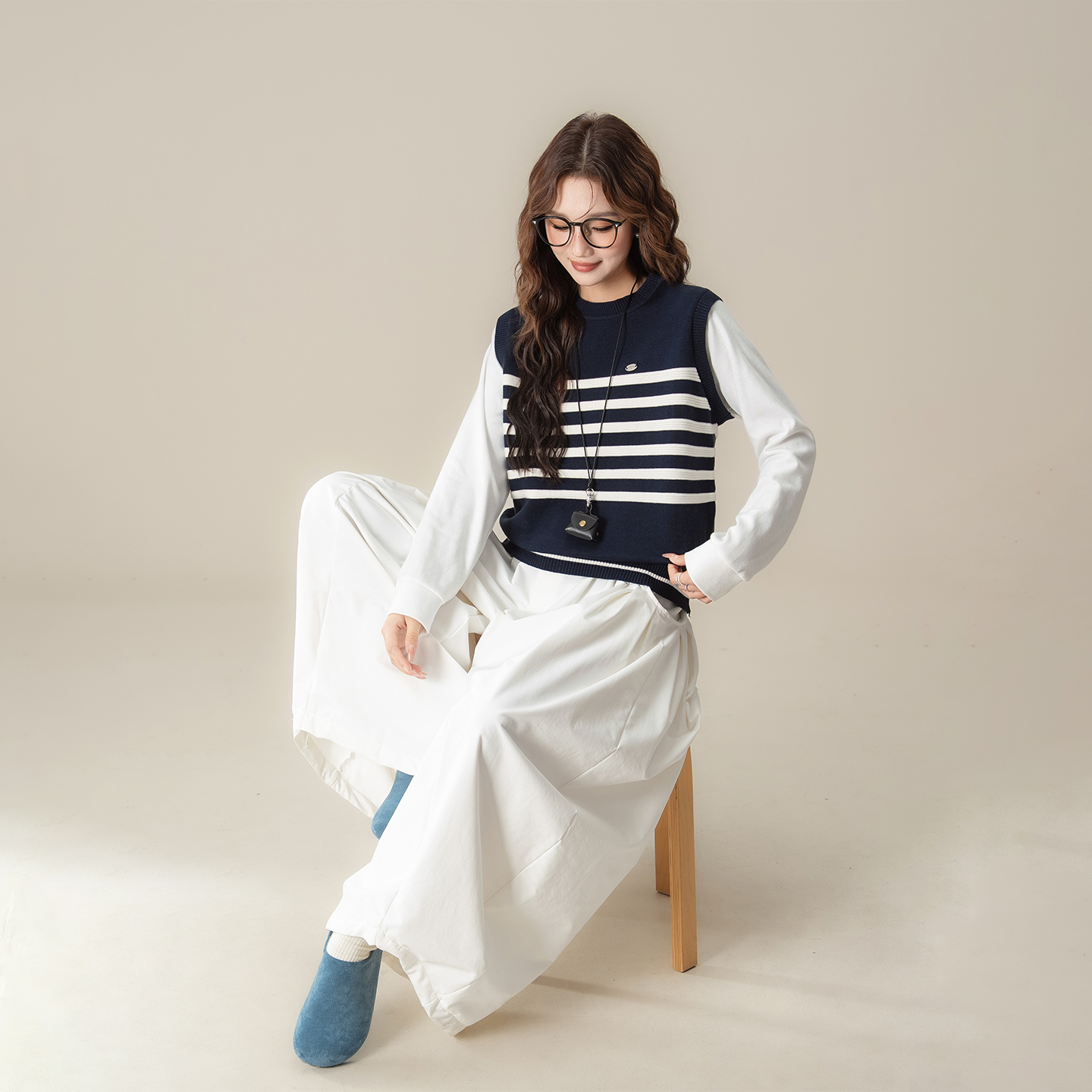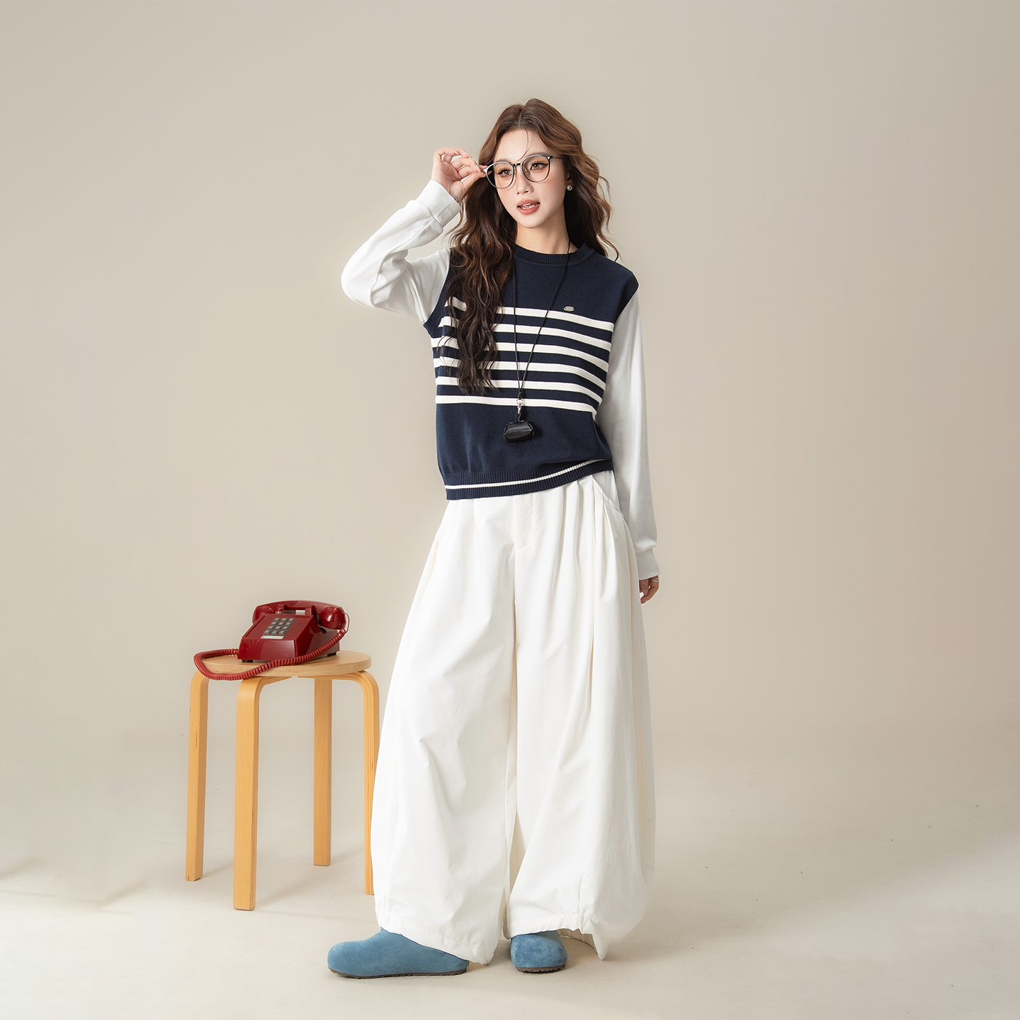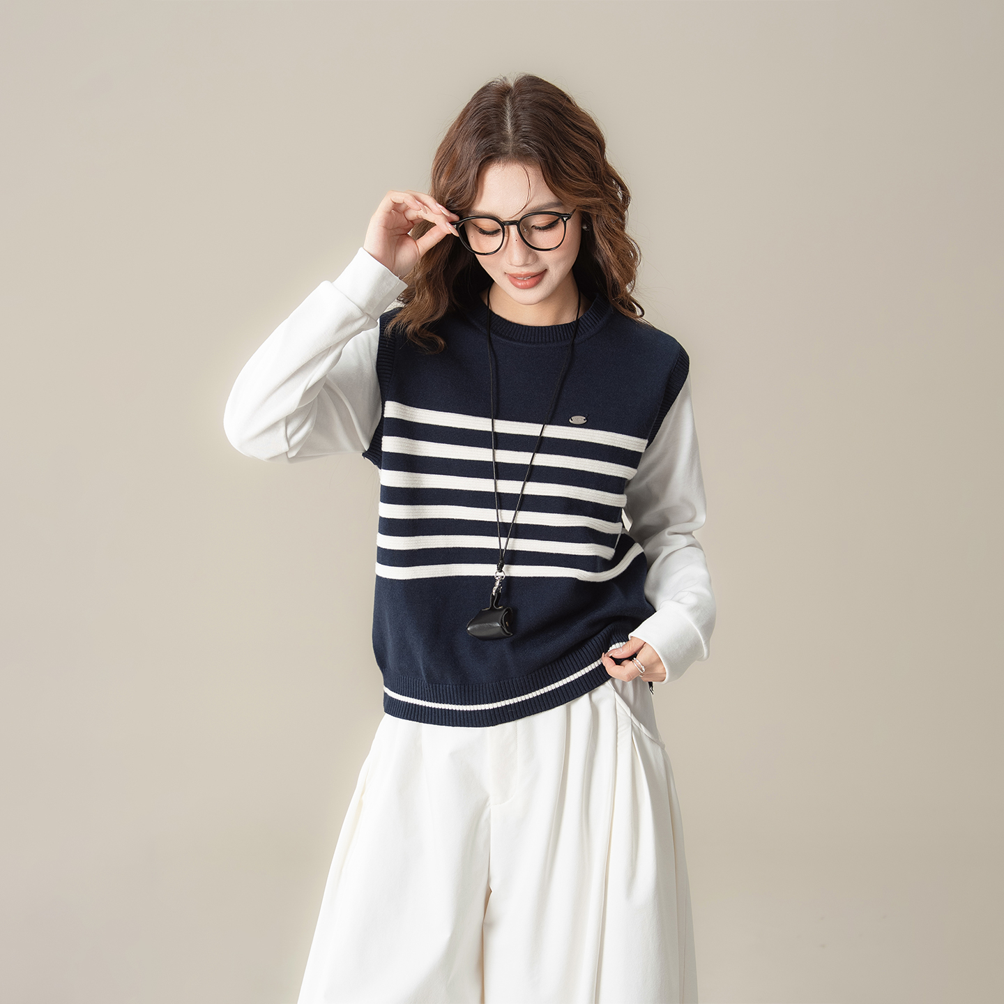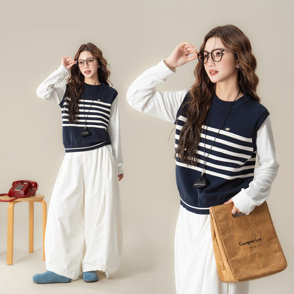慵懒慢人风条纹针织衫女2025秋季新款拼接圆领毛衣时尚假两件上衣