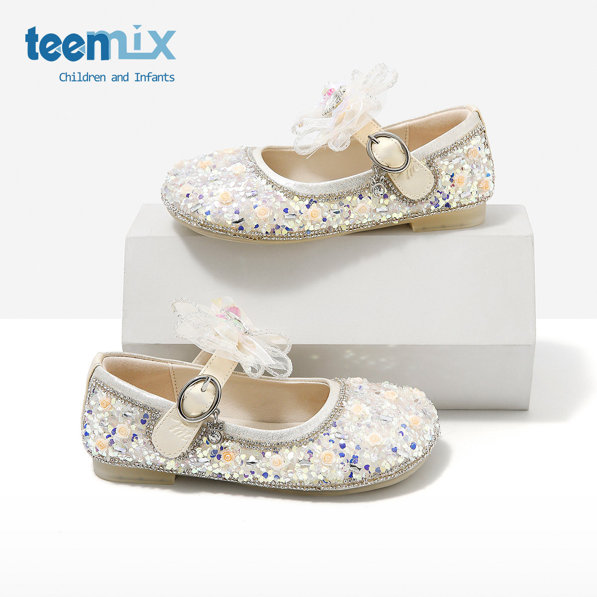 teenmix女童公主鞋2026年新款儿童皮鞋可爱蝴蝶结亮片女孩水晶鞋