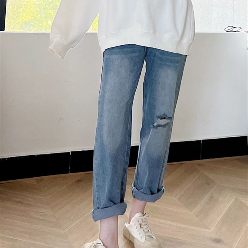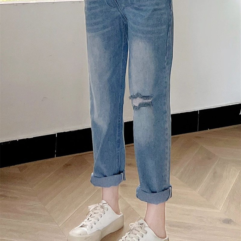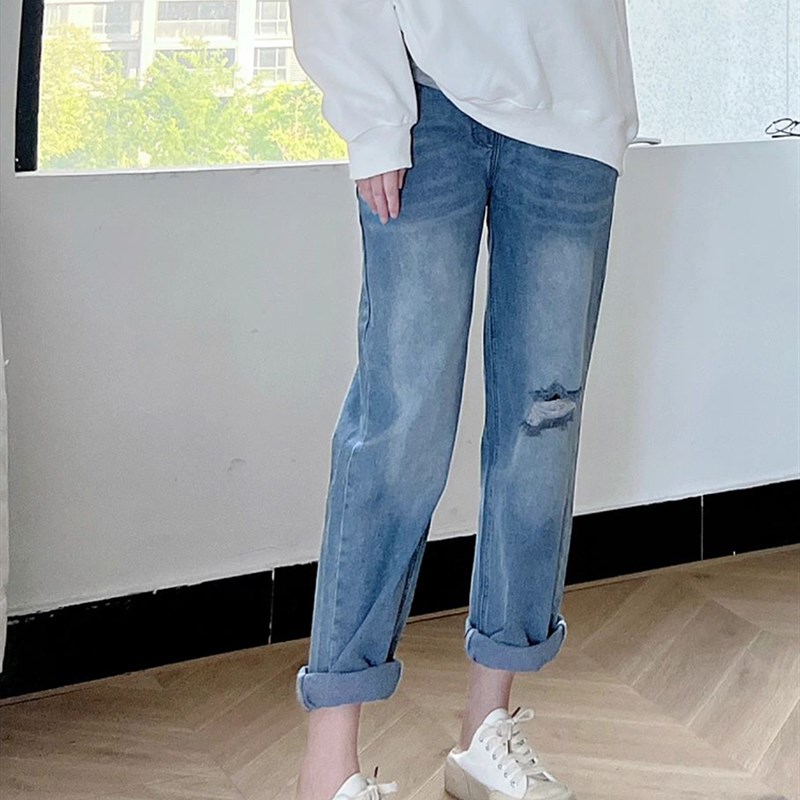 浅蓝色牛仔裤女i破洞宽松显瘦阔腿裤梨型身材大码胖妹妹九分老爹