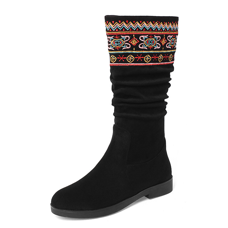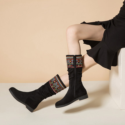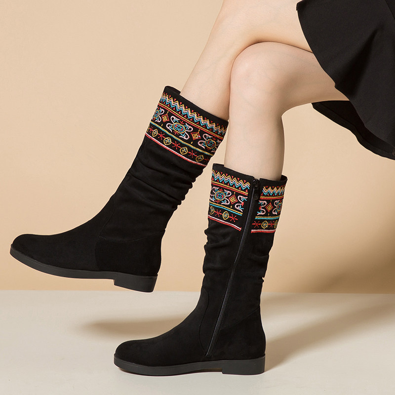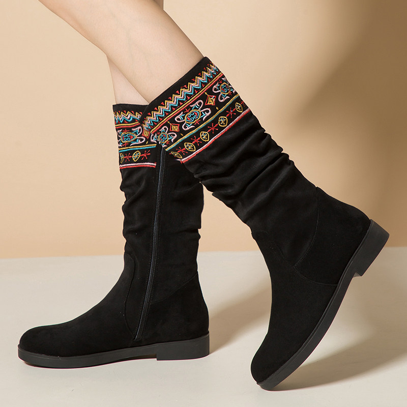 中筒靴长靴刺绣女靴子春秋单靴女冬年轻妈妈款短靴复古民族风女鞋