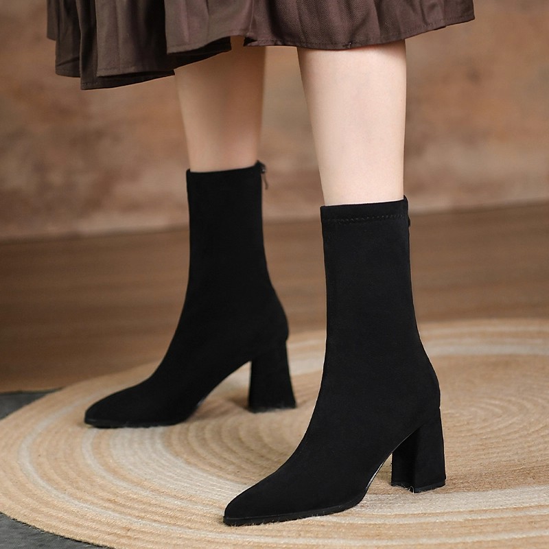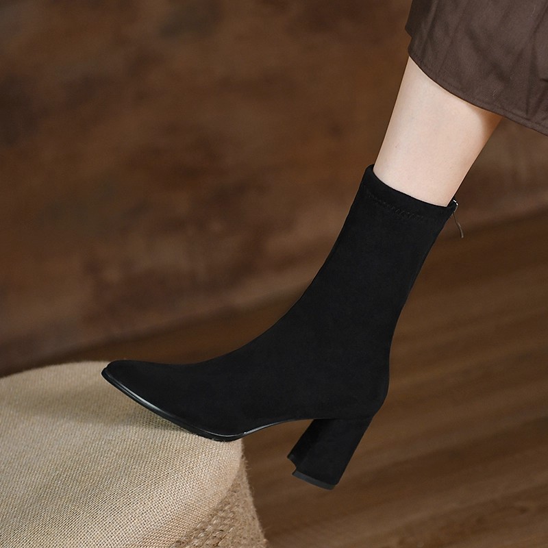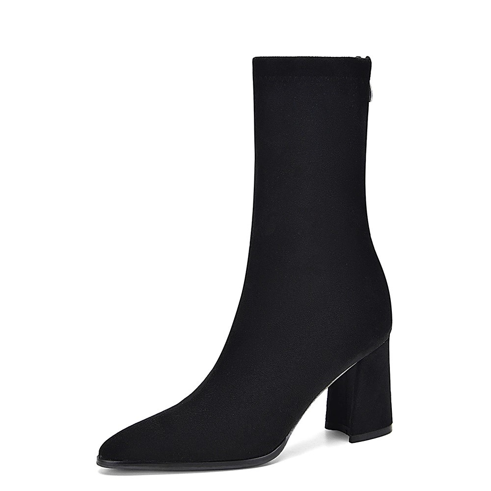 巨好穿手工黑色绒面显瘦短靴女冬季新款简约时尚尖头粗高跟瘦瘦靴