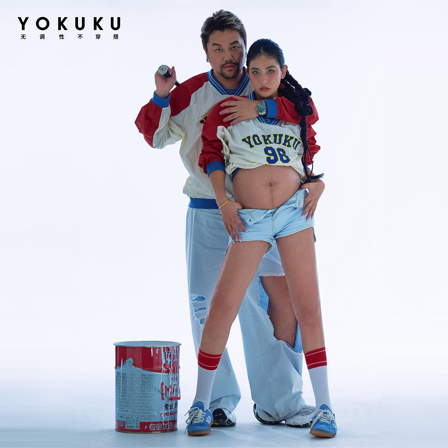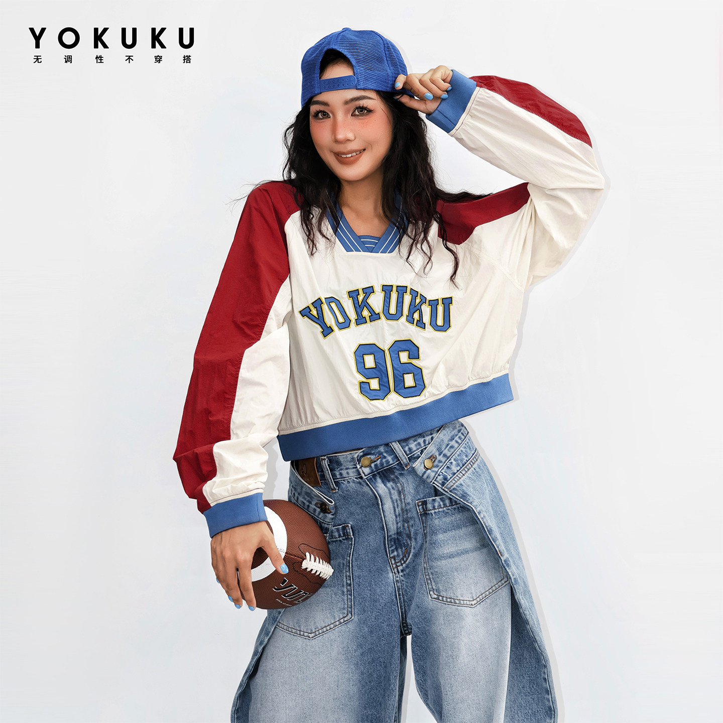 哟酷酷(亲爱的你)美式复古运动风上衣V领撞色长袖T恤女情侣卫衣