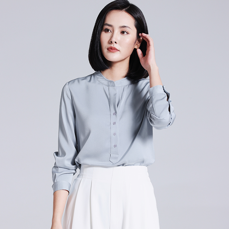 灰蓝色雪纺衬衫女长袖2025夏季新款高端时尚法式气质立领职业时髦