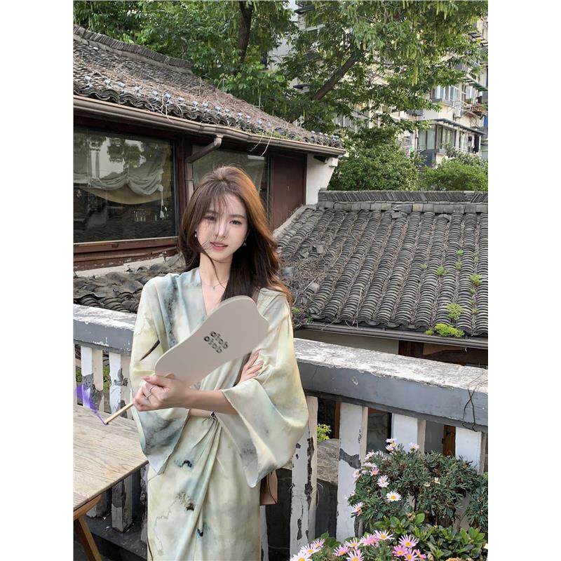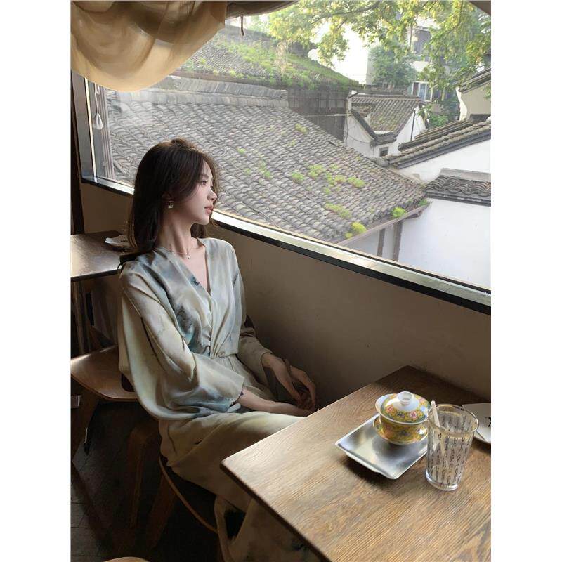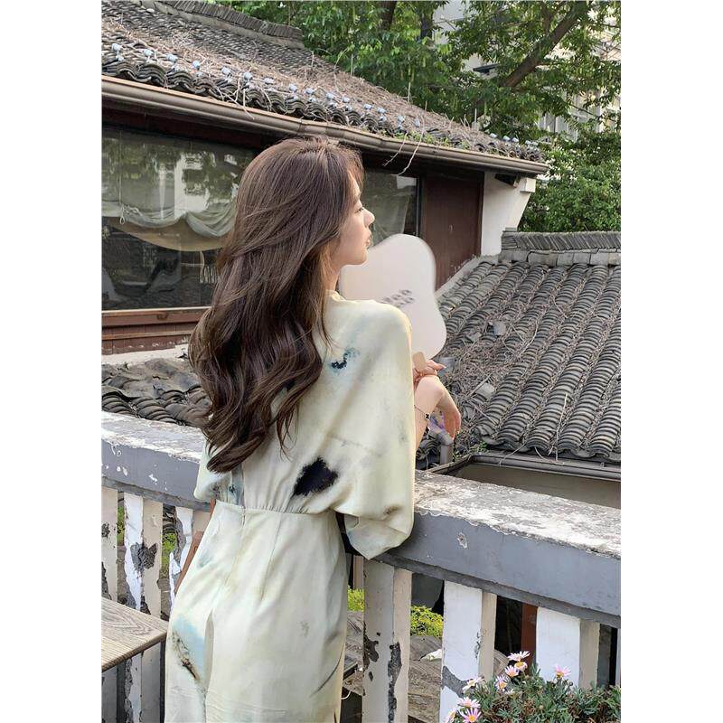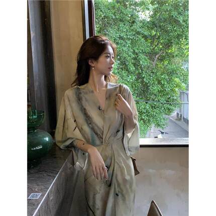 霖儿同款小众设计V领新中式脂玉水墨印花扭结收腰长款真丝连衣裙