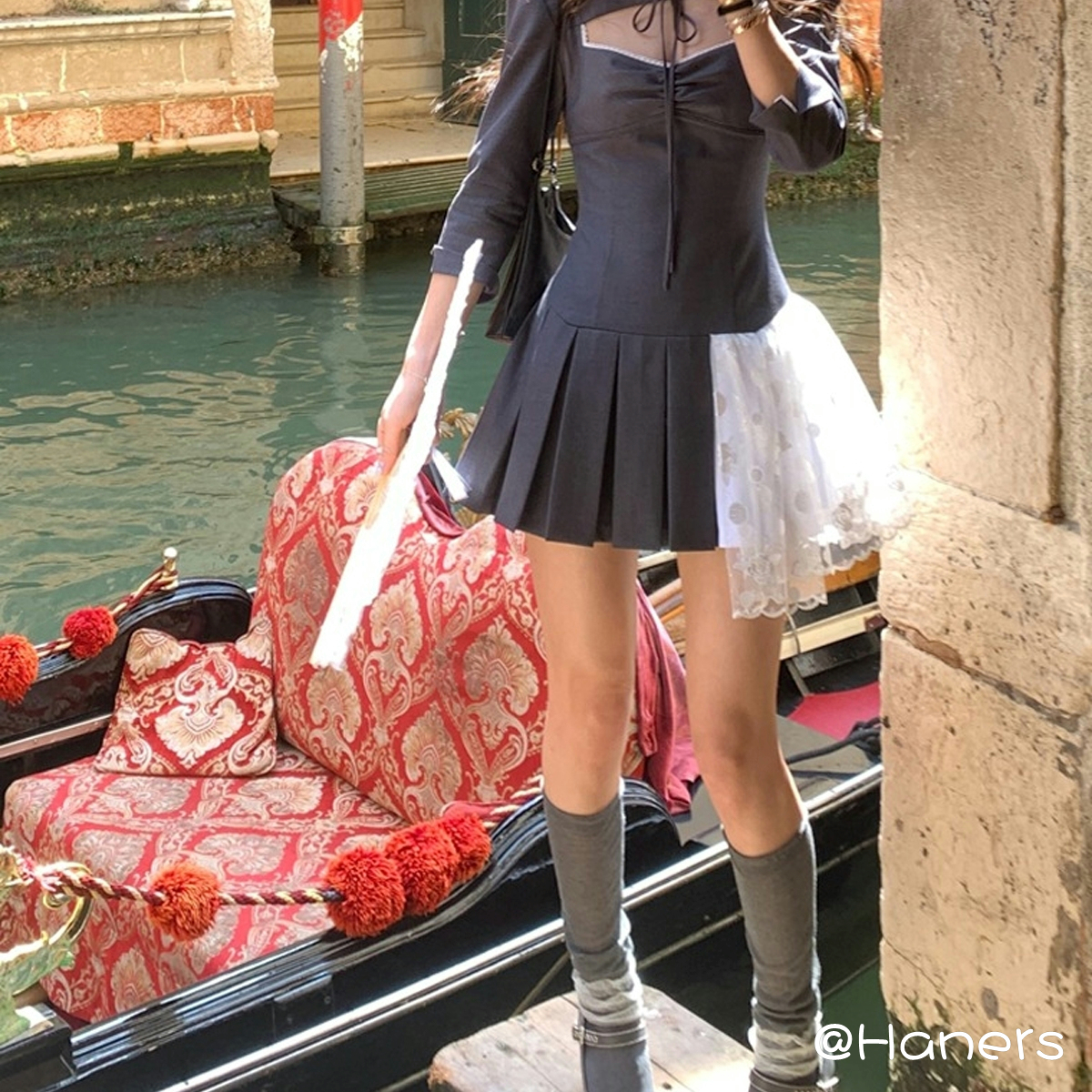 【设计师款】Haners家韩国代购法式女2025秋高定蕾丝拼接连衣裙