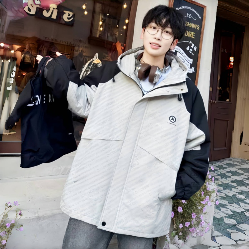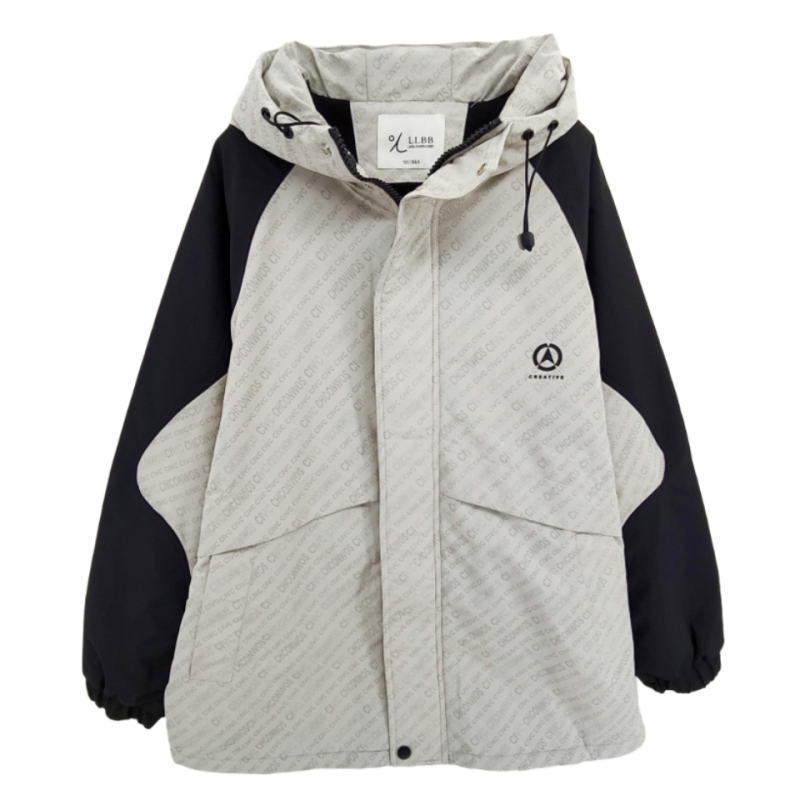 2025秋冬款男大童拼色户外加绒棉风衣初高中学生满印字母棉服潮流
