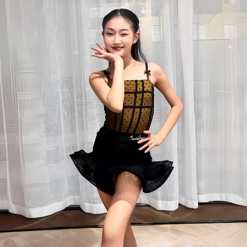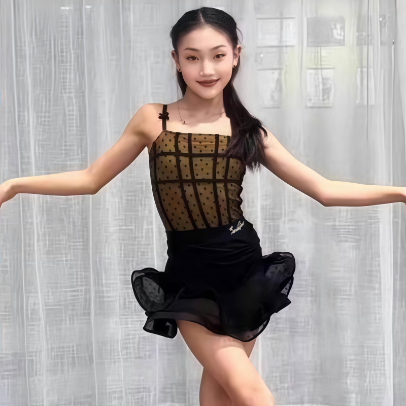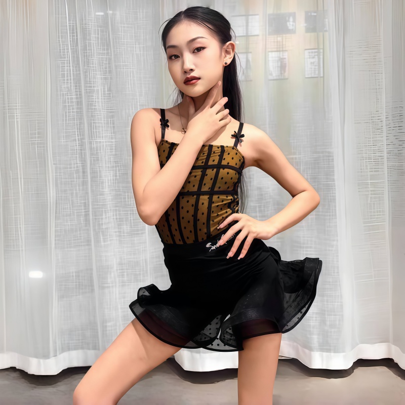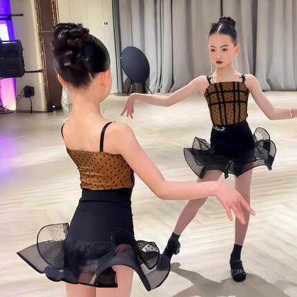 2025夏季新款舞服女童拉丁波点吊带上衣优雅鱼骨半裙套装演出服