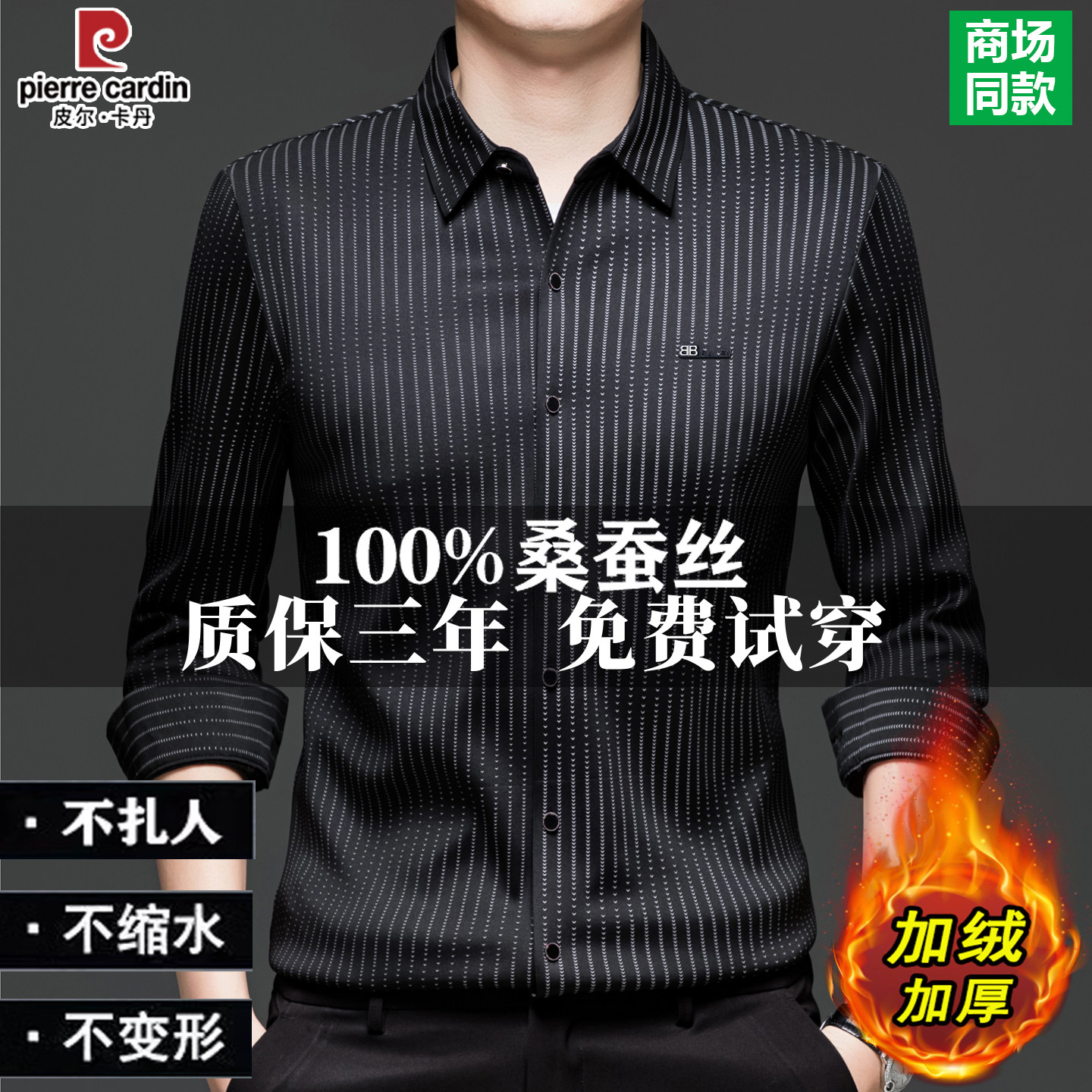 皮尔卡丹男士桑蚕丝长袖衬衫加绒加厚款时尚条纹印花免烫抗皱衬衣