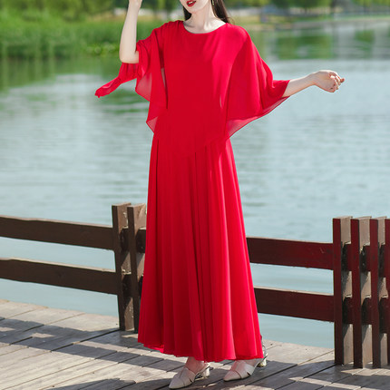 春夏新款国风时尚旅游度假真丝桑蚕丝连衣裙假两件沙滩拍照大长裙