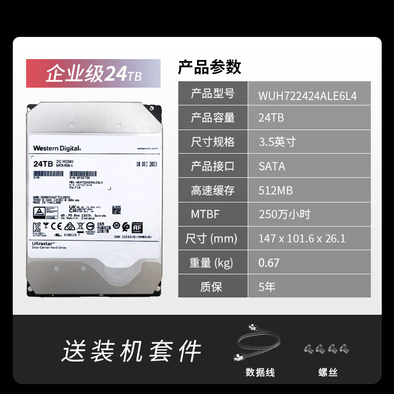 WD/西部数据 HC580 WUH722424ALE6L4 24TB SATA氦气企业级NAS硬盘