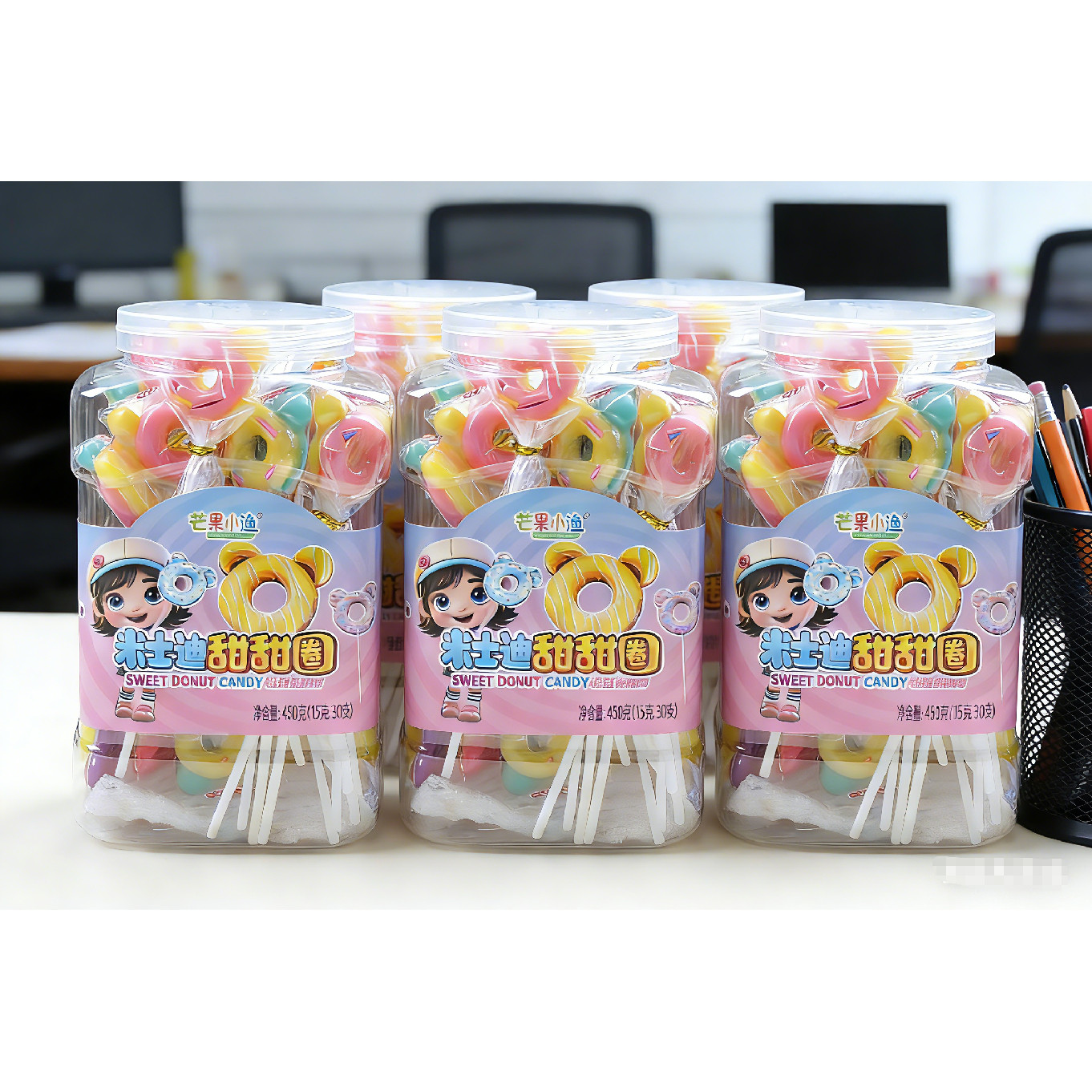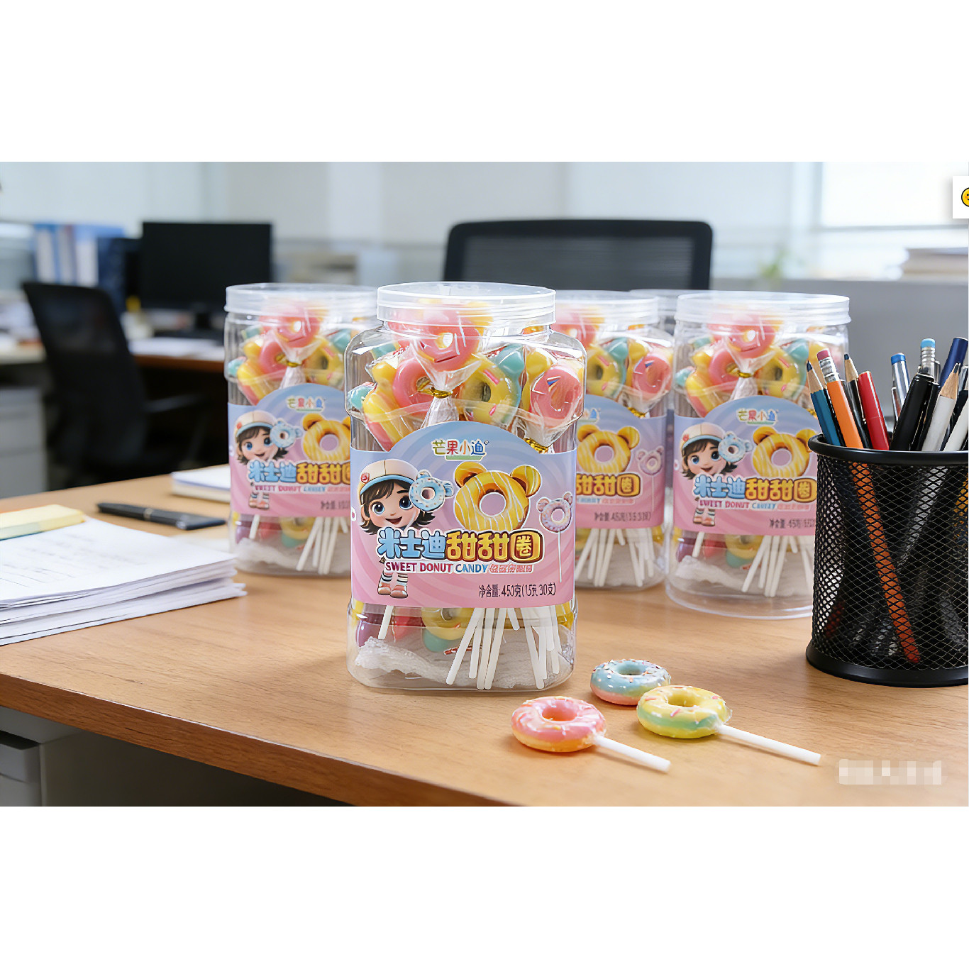 芒果小迪甜甜圈棒棒糖桶装水果味硬糖儿童礼物奖励七彩棒棒糖果