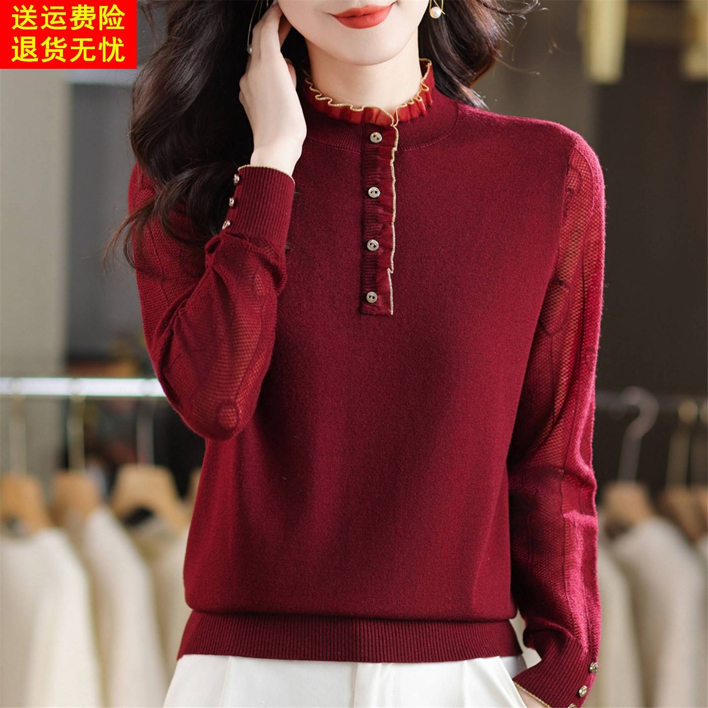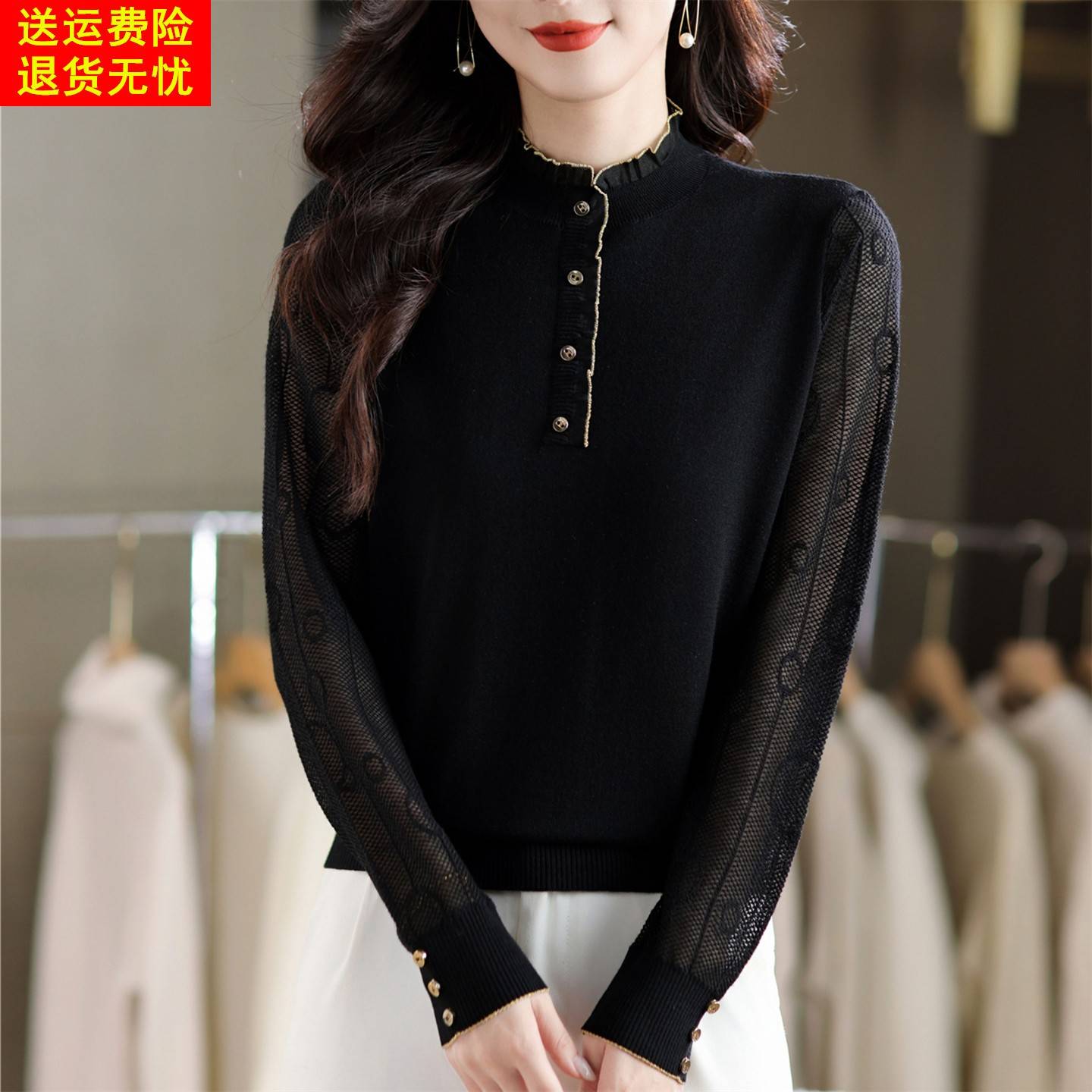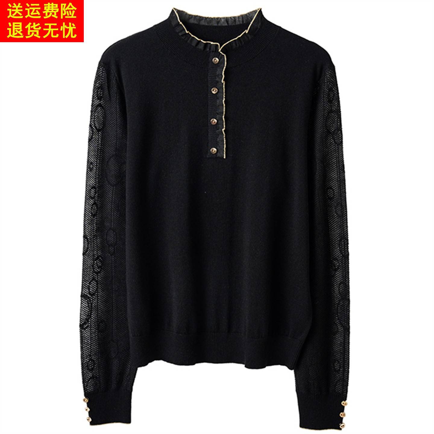 大牌桑蚕丝长袖t恤女妈妈春秋装木耳领洋气纱袖上衣蕾丝打底小衫