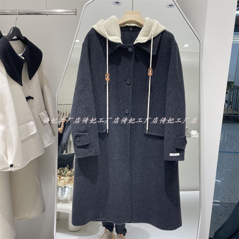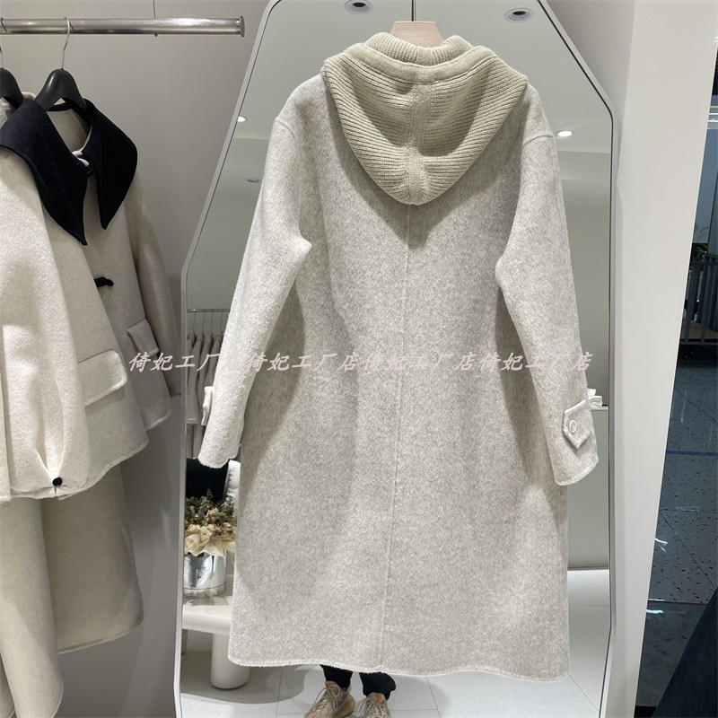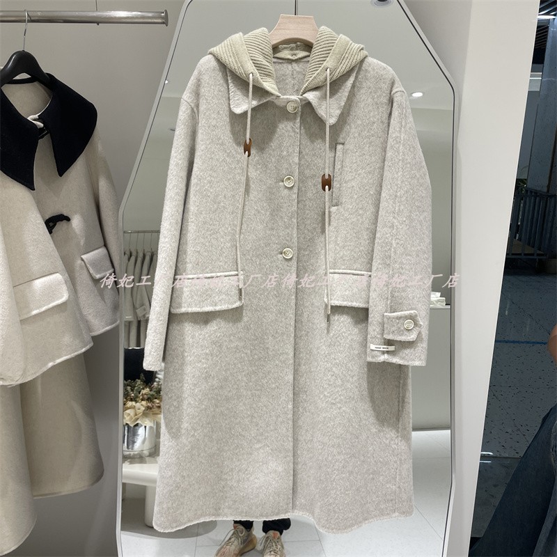 韩国东大门2024秋冬羊毛呢双面呢大衣女欧洲站小个子长款连帽针织