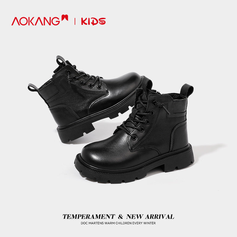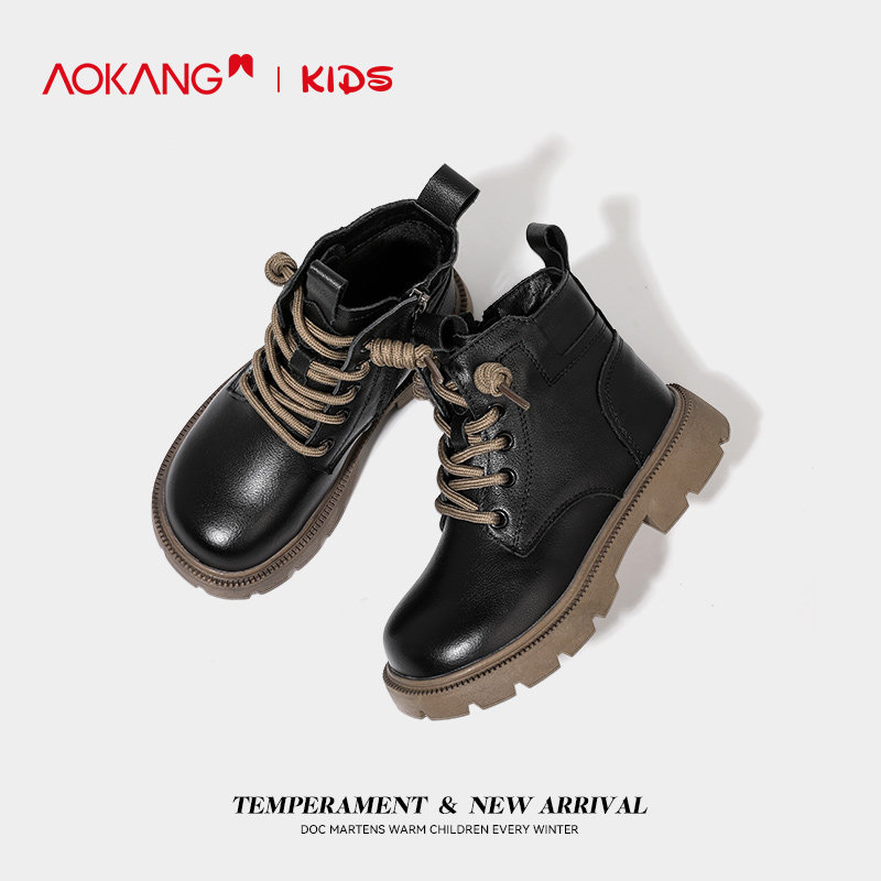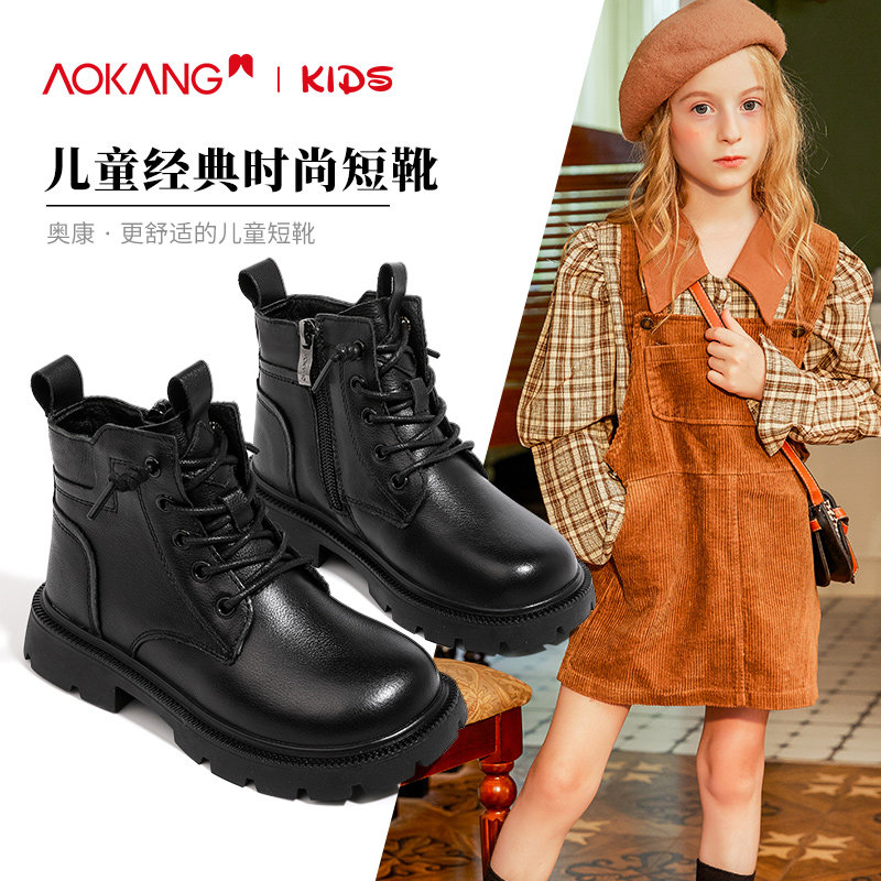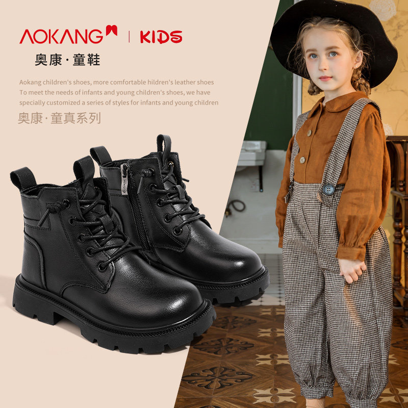 奥康童鞋女童靴子2025新款冬季真皮加绒女孩黑色皮鞋中大童马丁靴