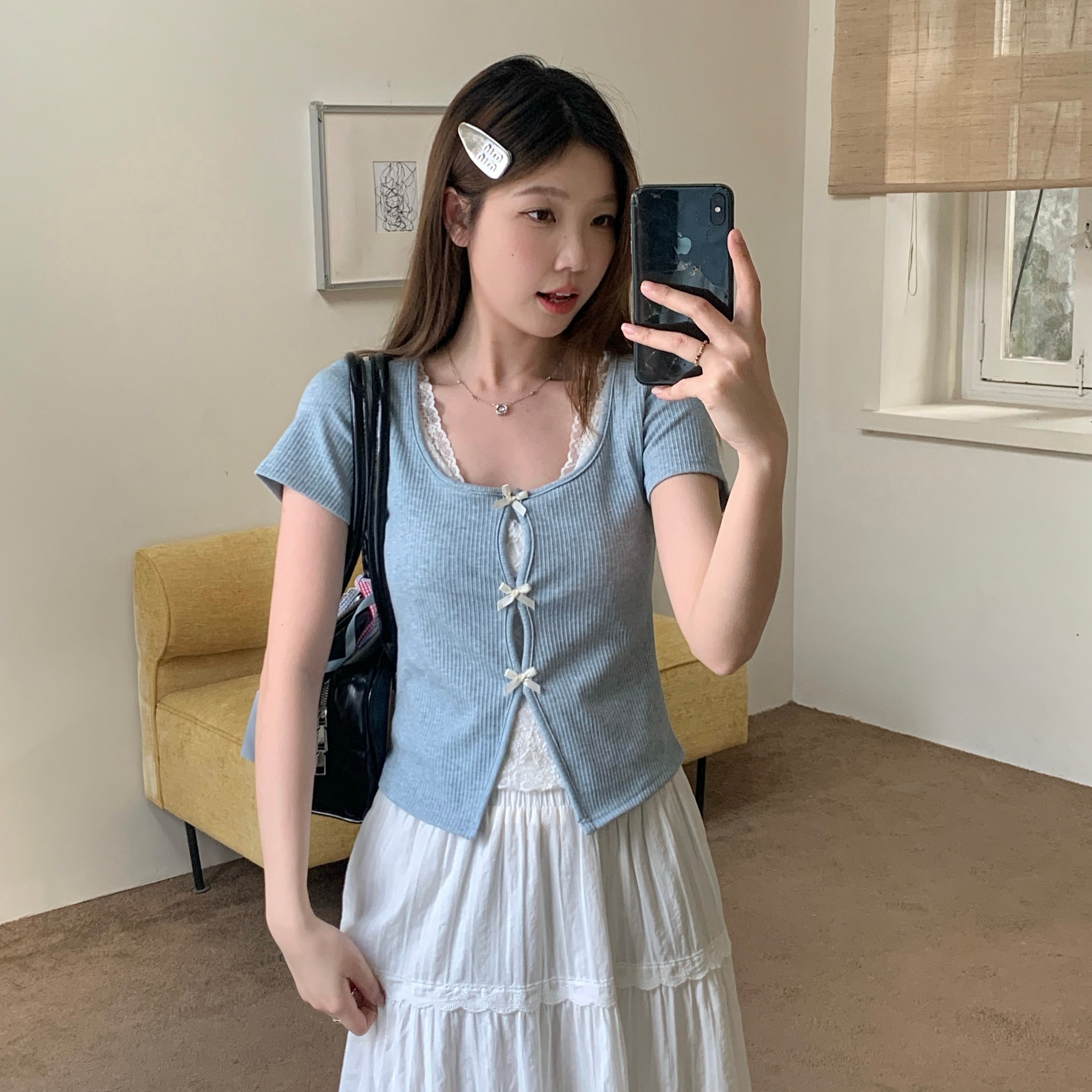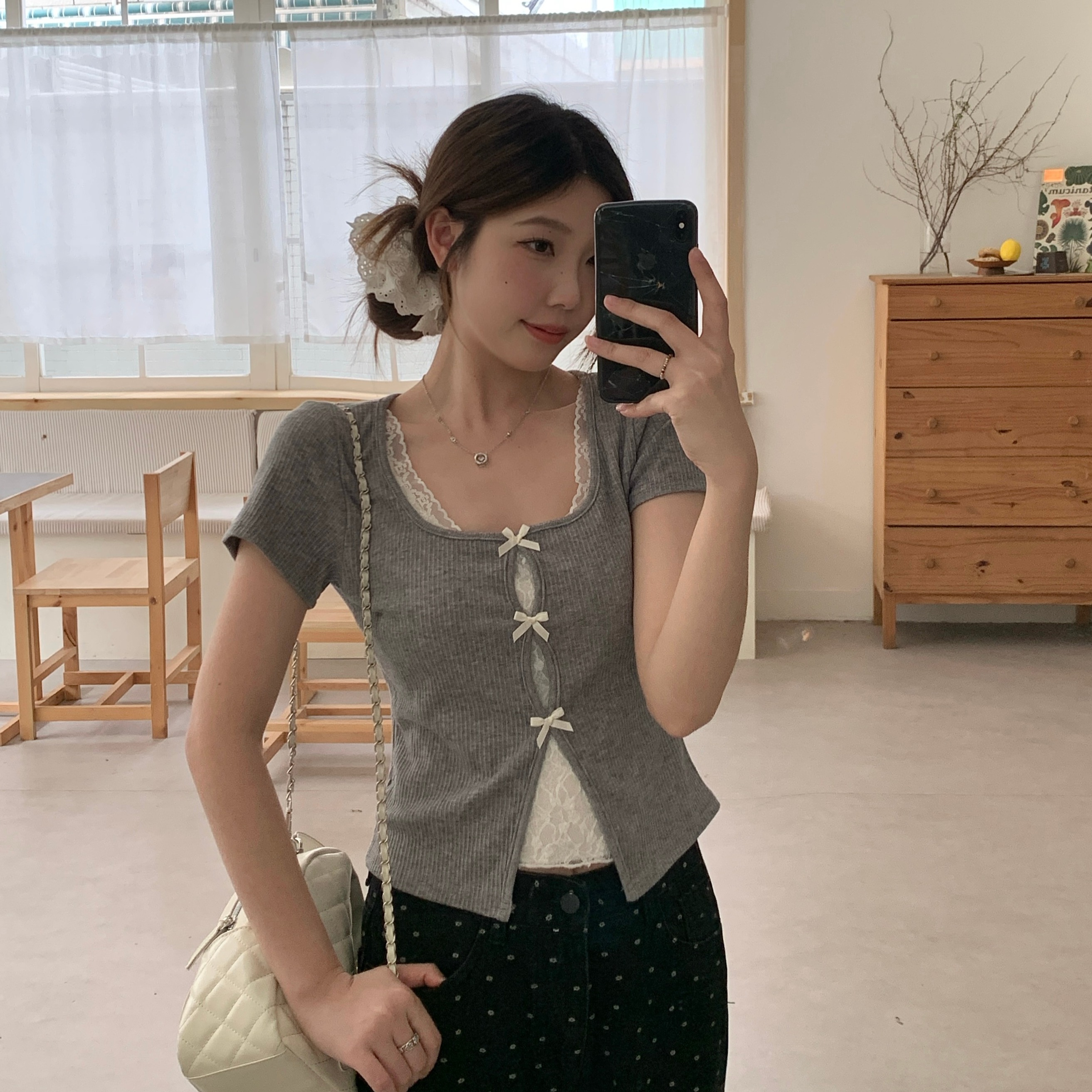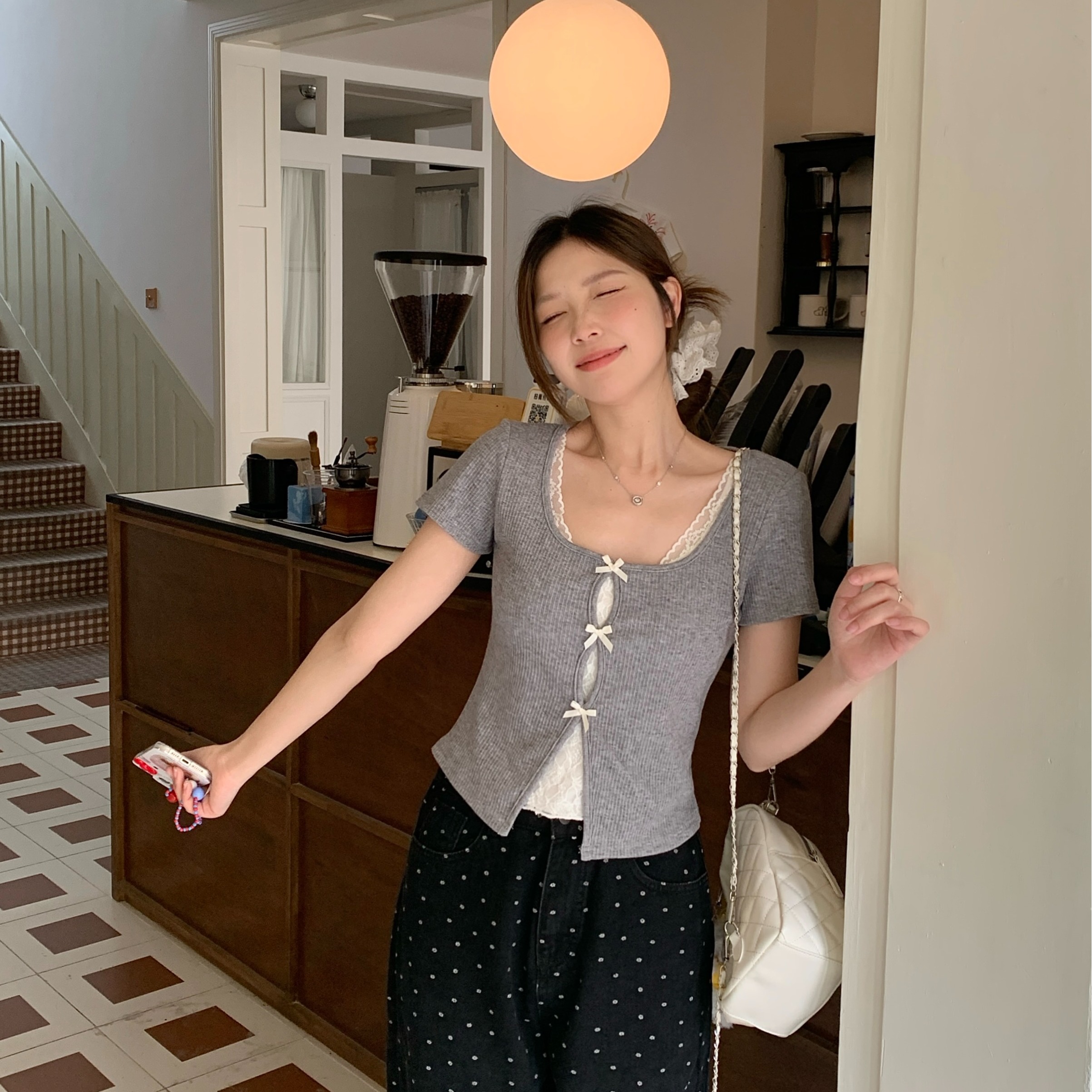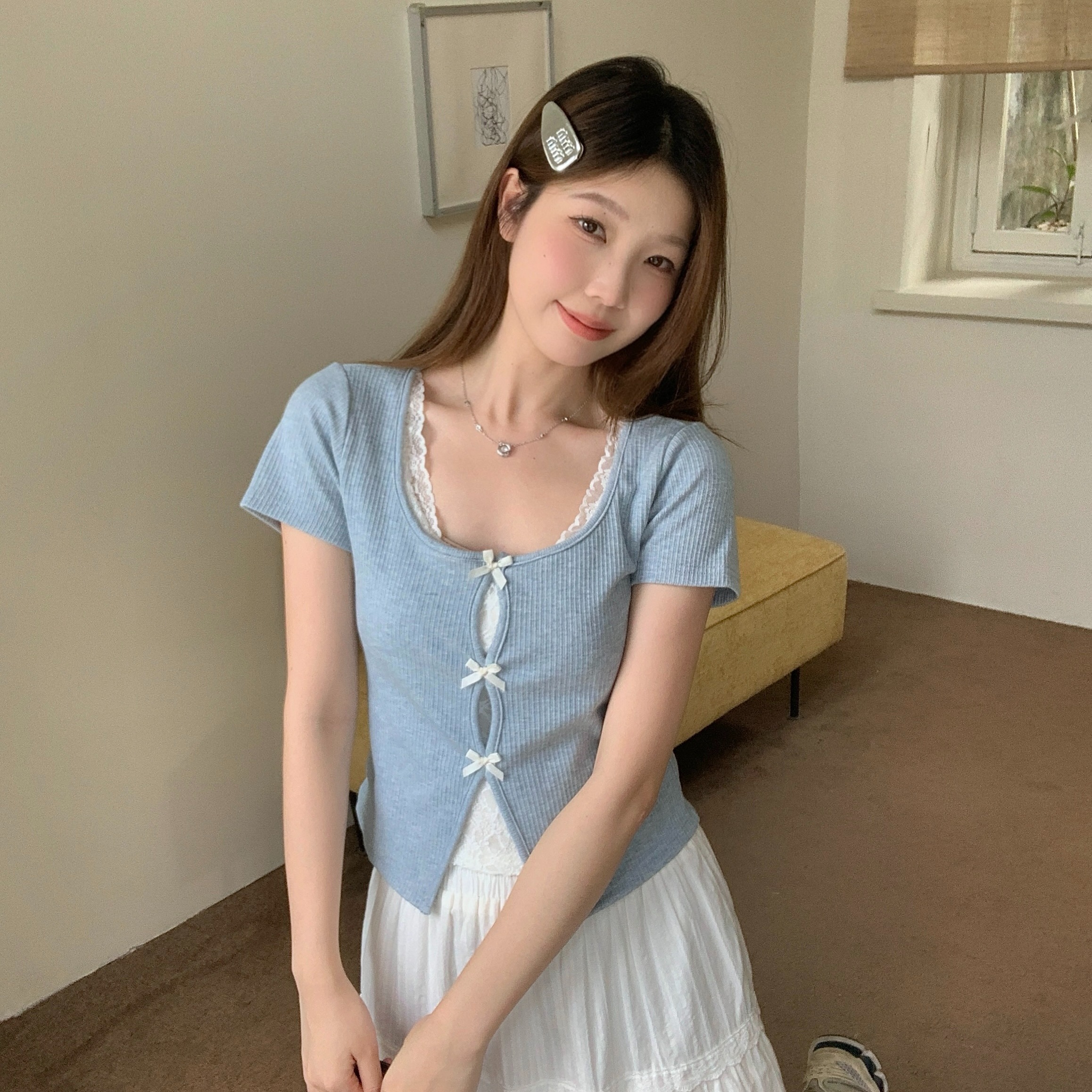 MM谢谢家大码2025夏季新款蕾丝拼接假两件短袖T恤纯欲修身上衣女