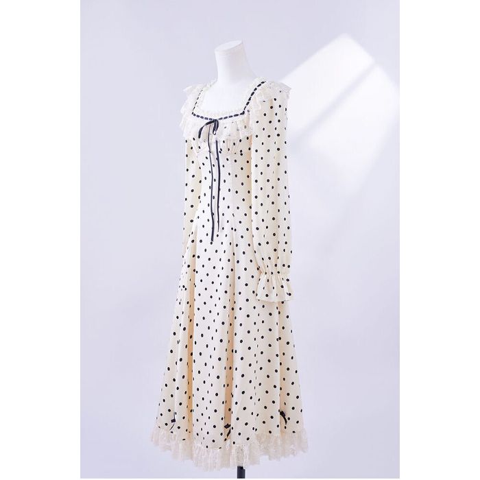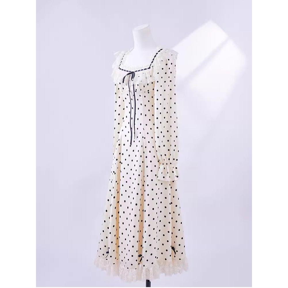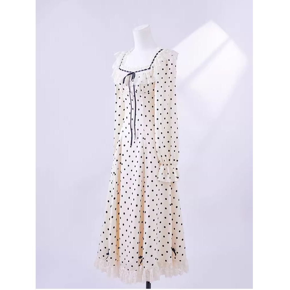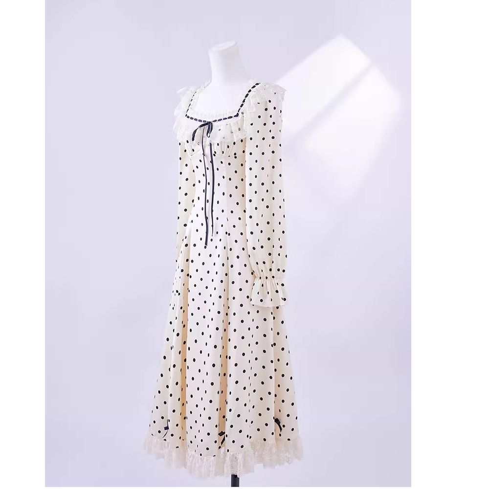 法式波点方领蕾丝连衣裙女秋季新款温柔风气质复古收腰显瘦长裙子