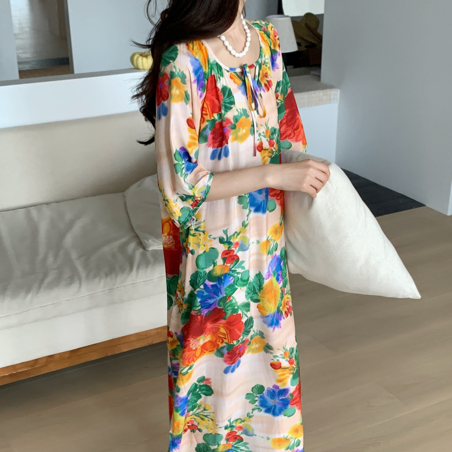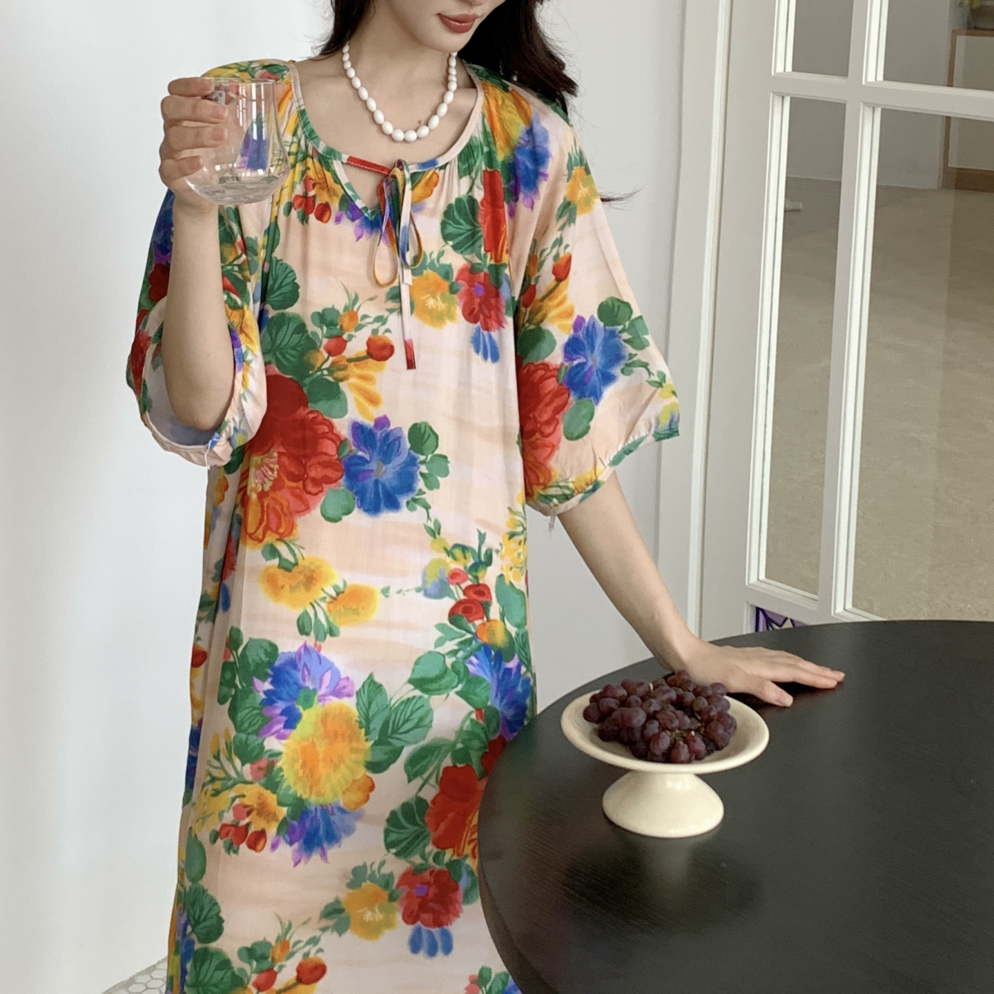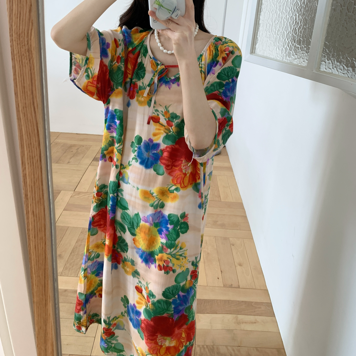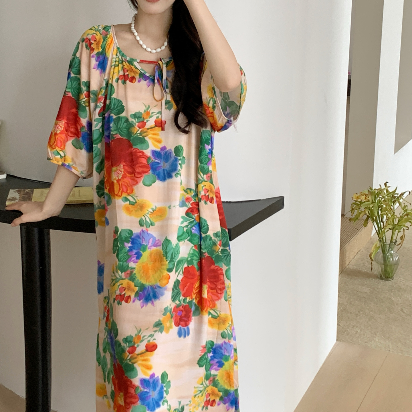 法式浪漫连衣裙短袖中长款棉绸睡裙茶歇碎花裙子可外穿人棉睡衣裙
