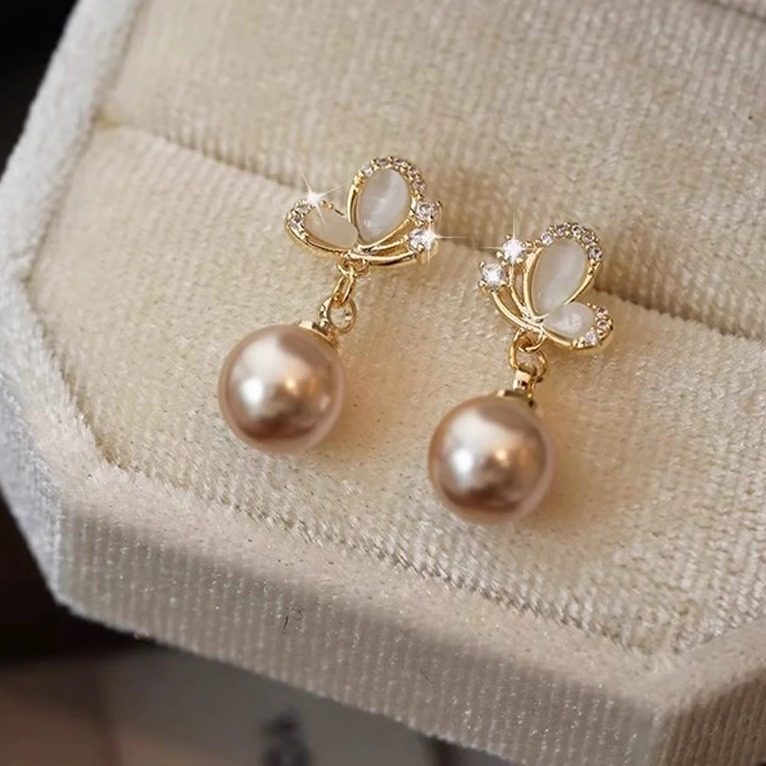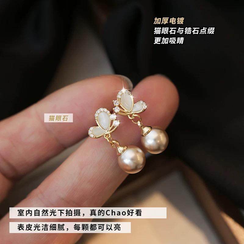 S925纯银猫眼石珍珠蝴蝶耳钉女高级感轻奢女小众设计耳环新款气质