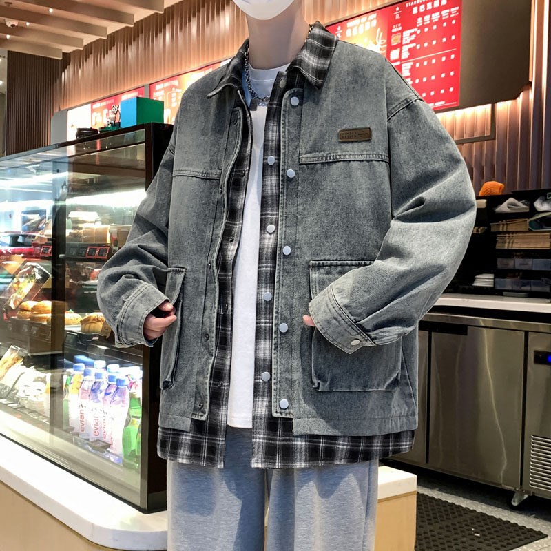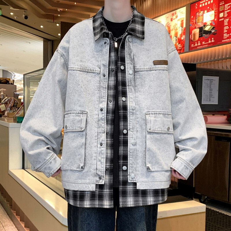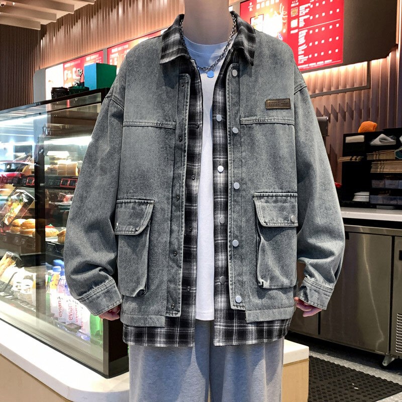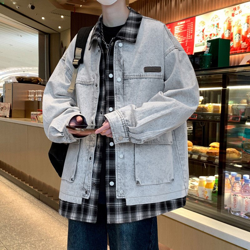 假两件牛仔衣外套男春秋季帅气初高中学生夹克青少年潮流复古褂子