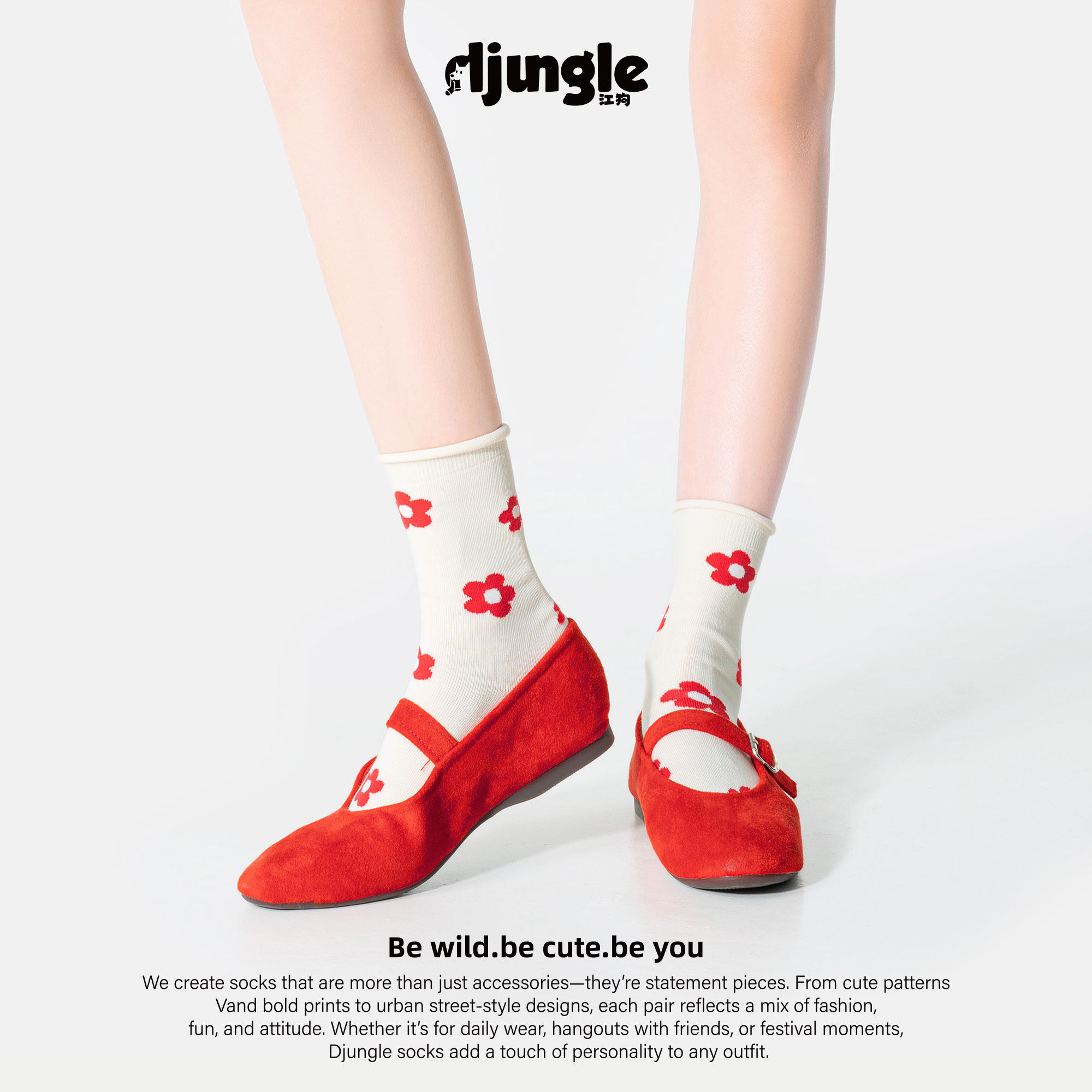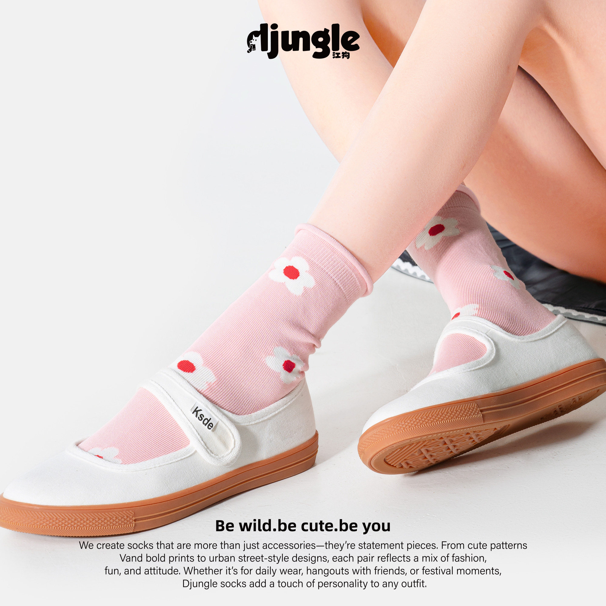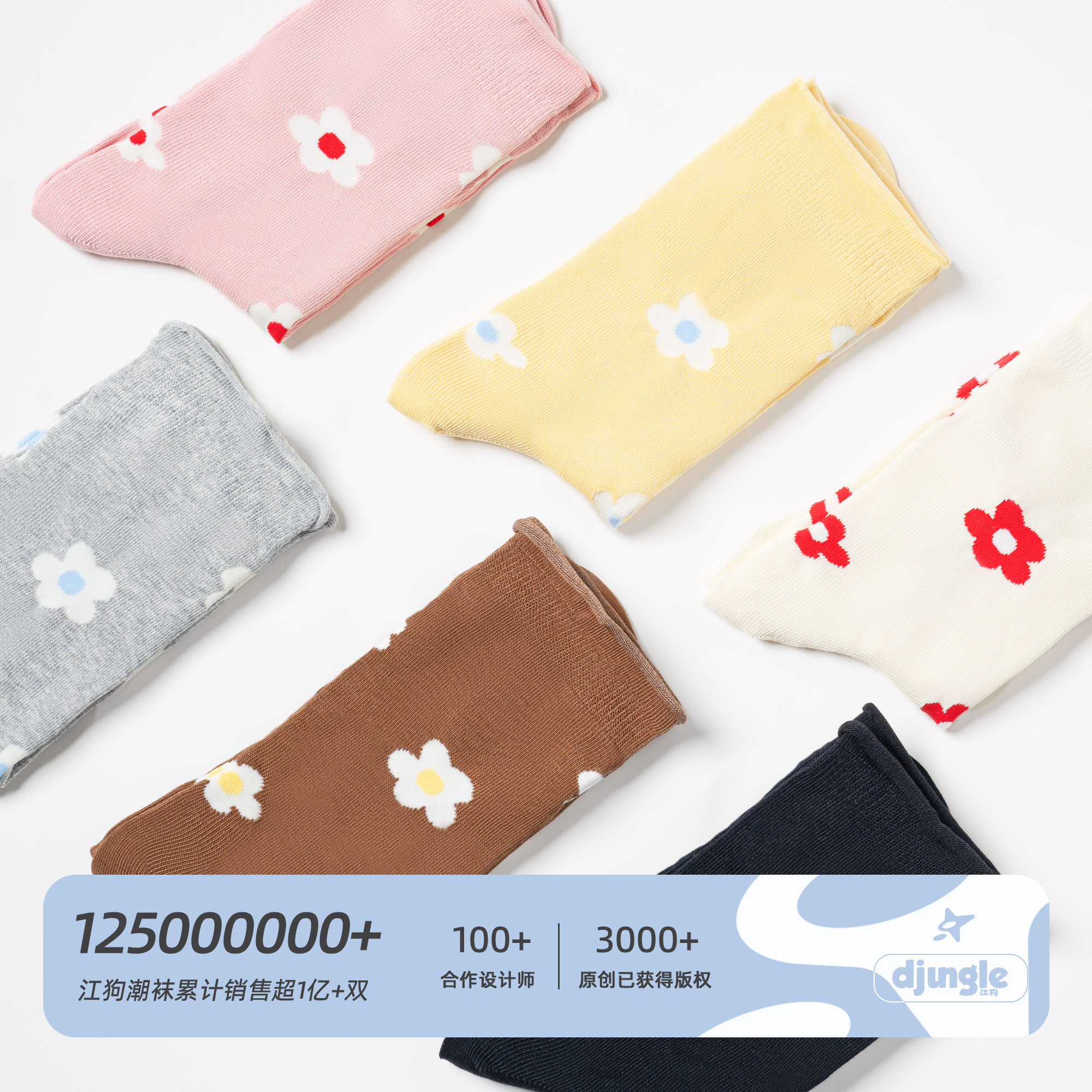 江狗花朵袜子女秋冬中筒袜ins潮可爱卡通卷边堆堆袜彩色甜美长袜