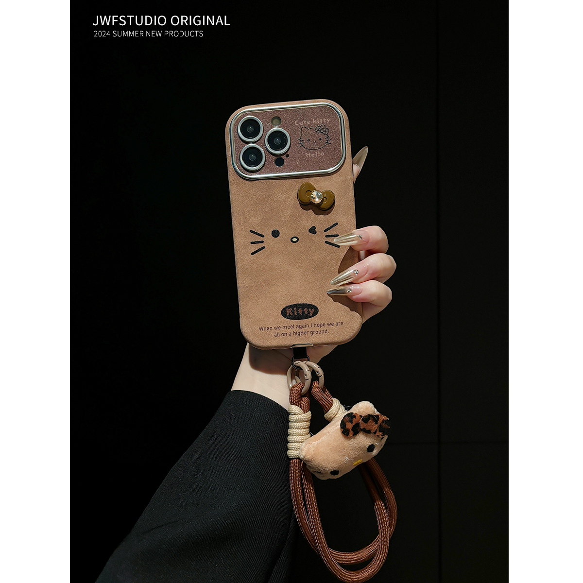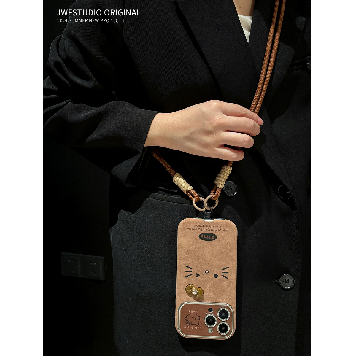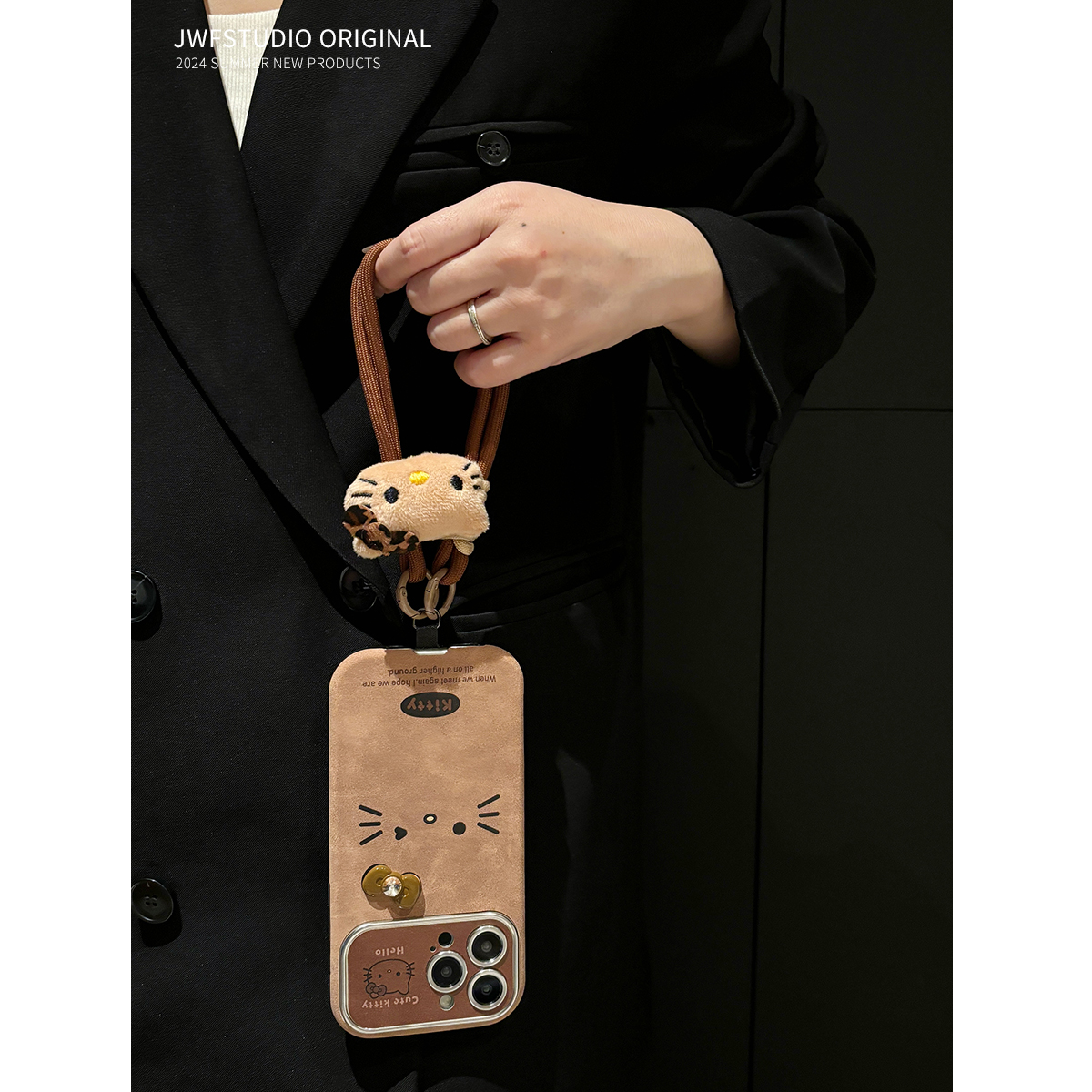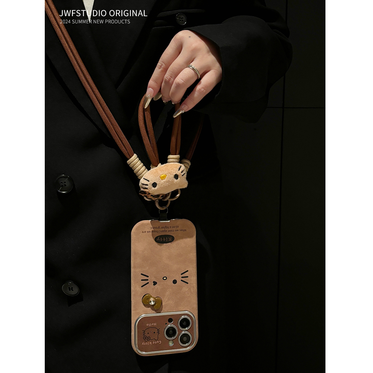 棕色可爱kt猫适用iphone16promax新款手机壳16pro铃铛毛球苹果15pro高级感13套12防摔14ProMax秋冬11皮套挂绳