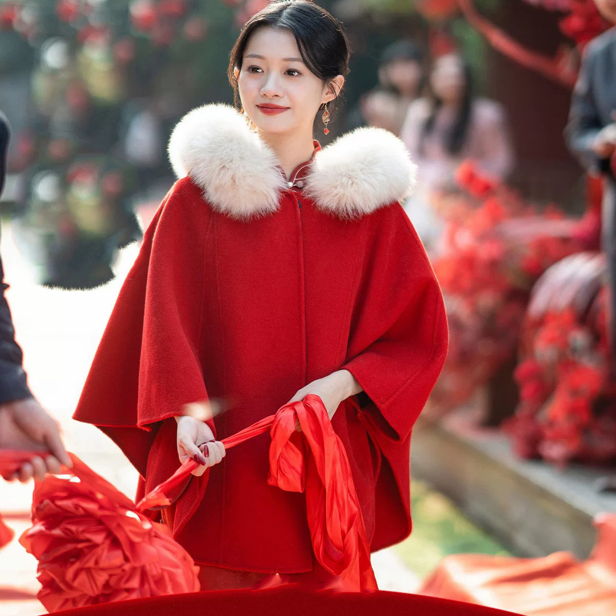 深情红色毛呢外套小个子气质优雅毛大衣旗袍礼服外搭