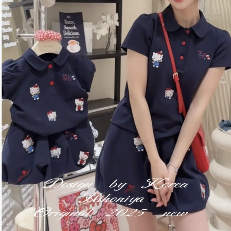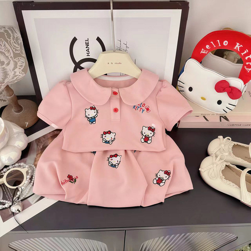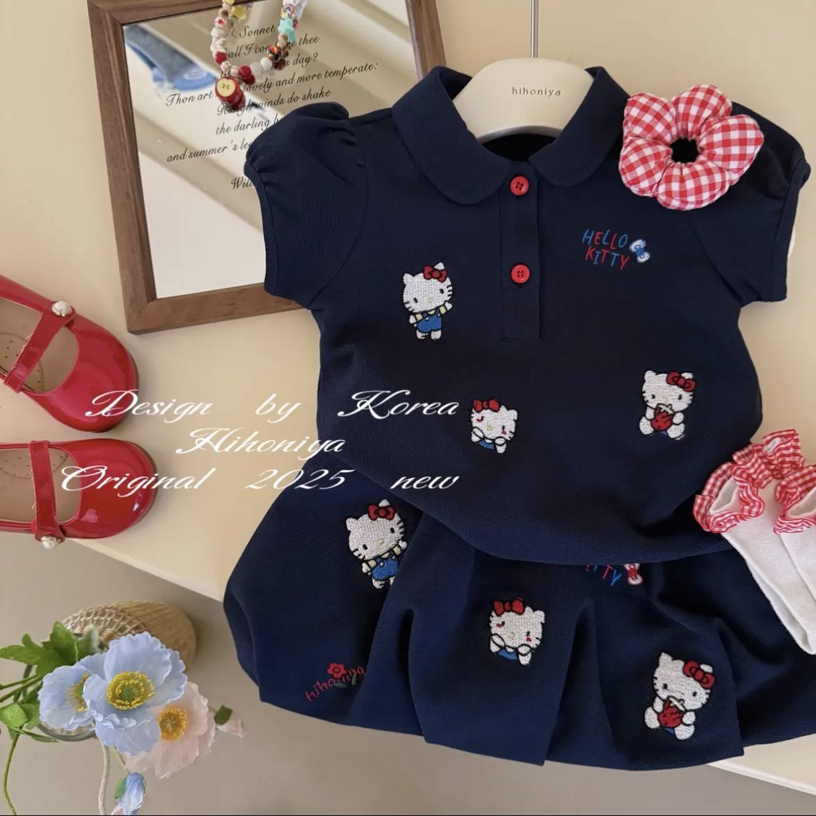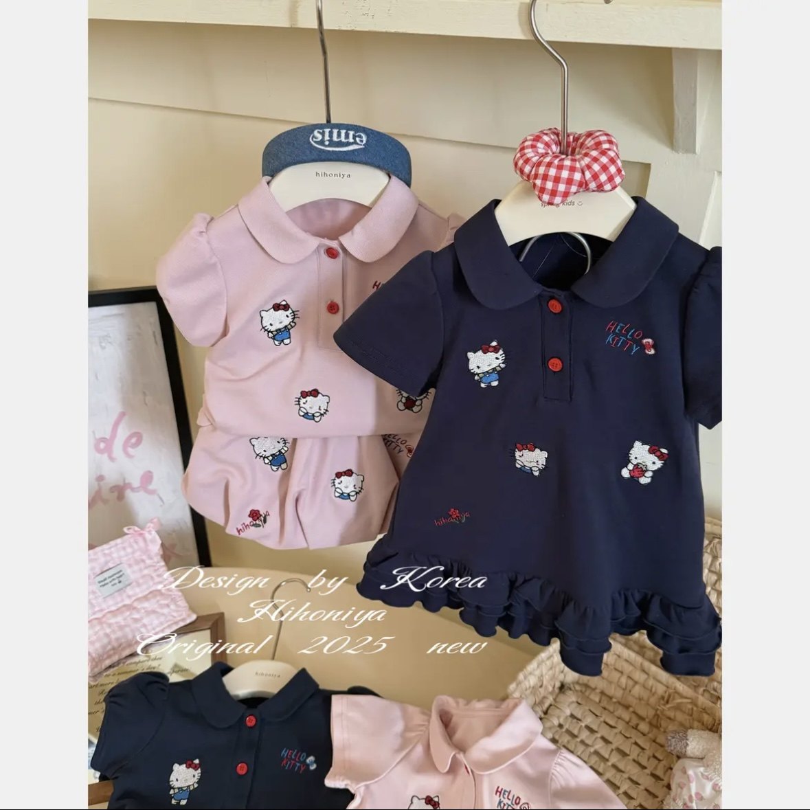 韩国童装女童夏季套装2025新款重工kitty卡通女宝宝短袖短裤套装