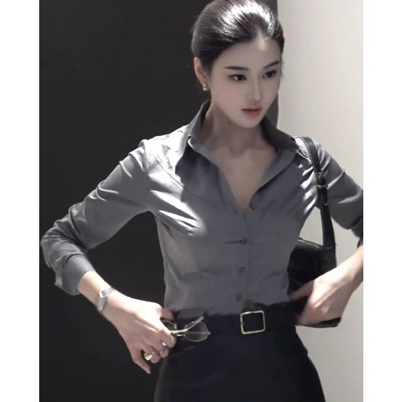 灰色衬衫女2025新款高级感通勤早秋修身显瘦职业气质长袖纯欲上衣