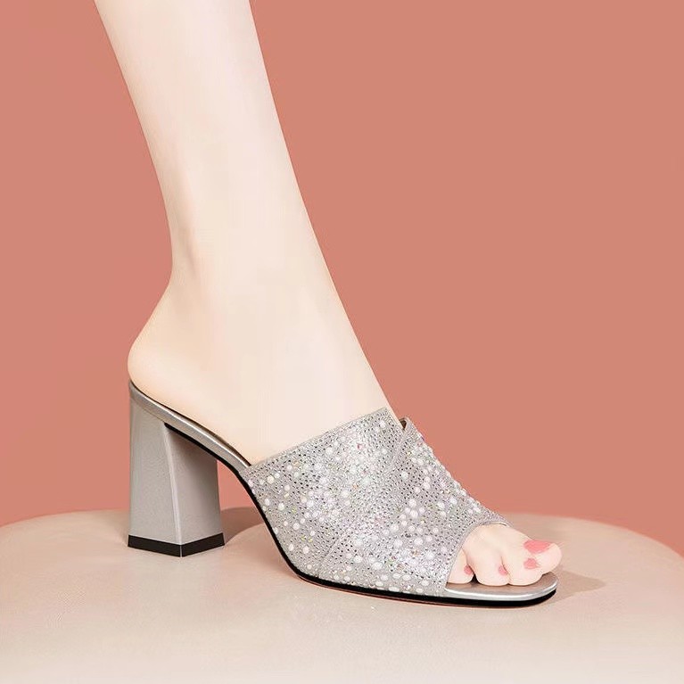 真皮牛皮粗跟拖鞋外穿2025夏季新款气质百搭鱼嘴水钻圆头大码女鞋