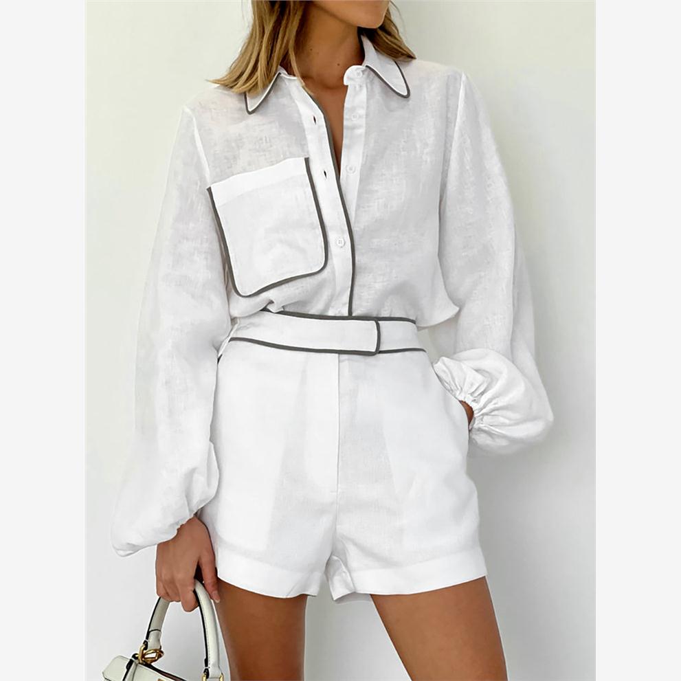 Shorts set欧美新款夏季时尚女棉麻白色小立领长袖短裤套装两件套