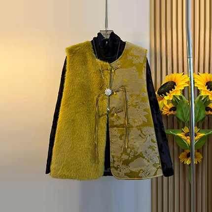 大码女装毛毛拼接花朵AB版国风马甲胖妹妹秋冬款高领长袖暗花小衫