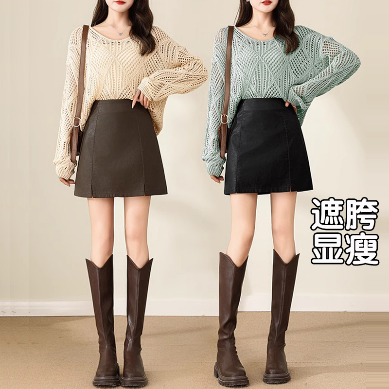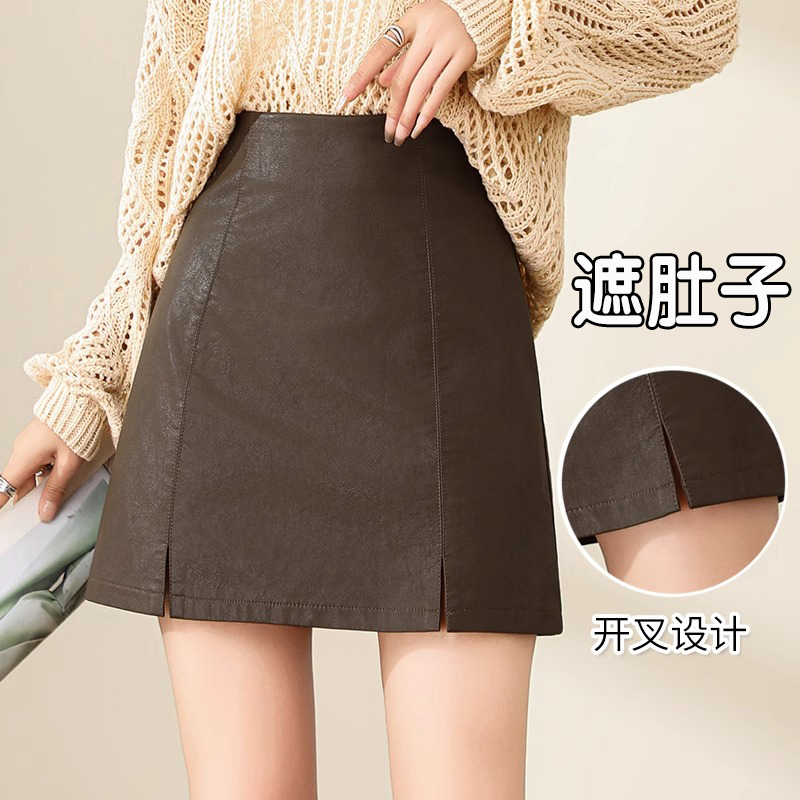 大码皮裙短裙女2024新款高腰a字裙子PU棕色包臀裙半身裙胖mm秋冬