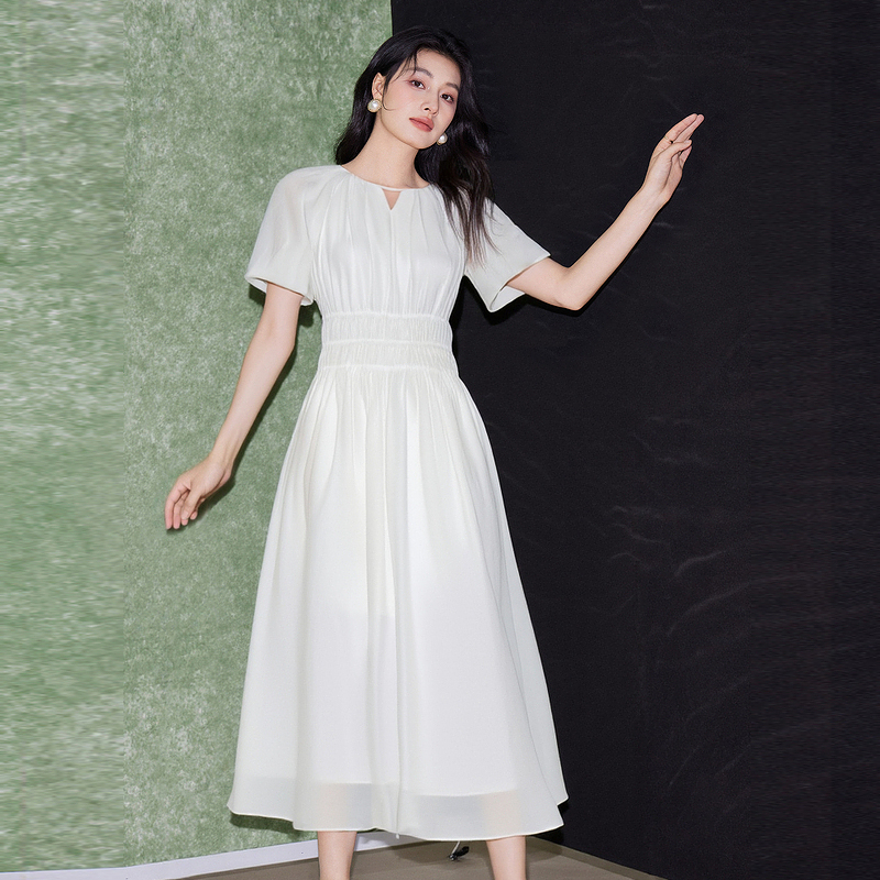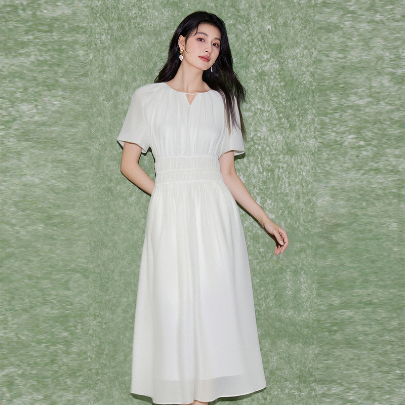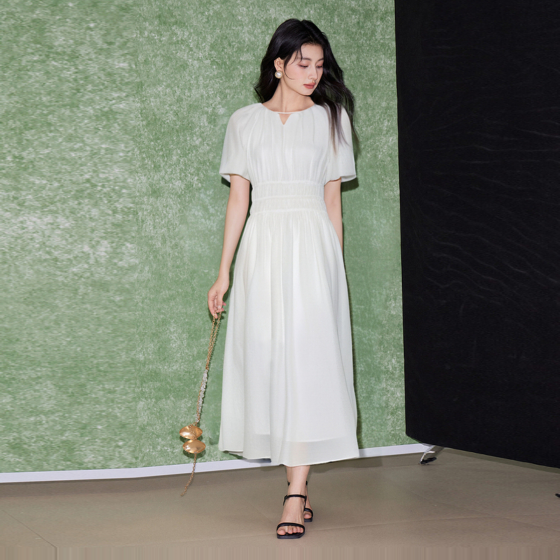 Basic House/百家好夏秋千金淡人风泡泡短袖设计感收腰A字连衣裙