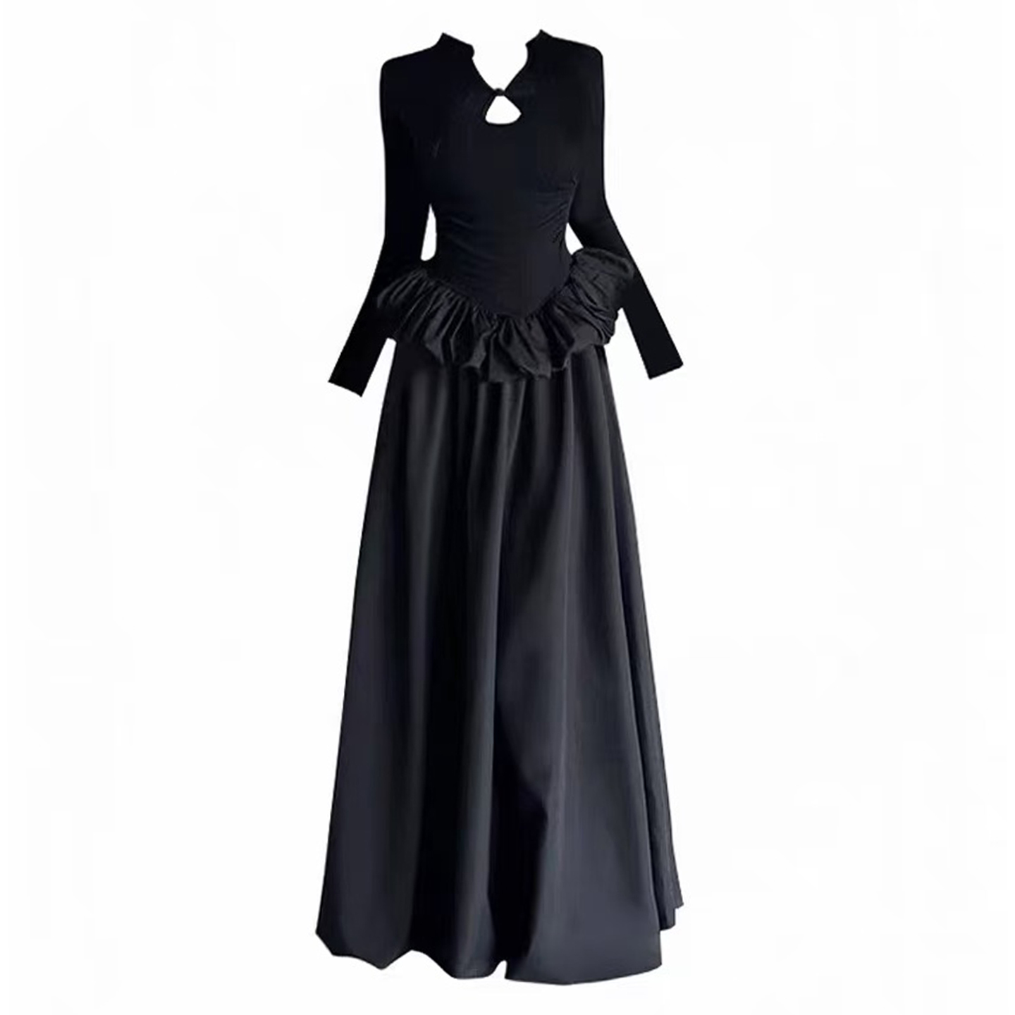 新中式立领盘扣长袖连衣裙女秋收腰显瘦高级感A字花苞蓬蓬长裙女