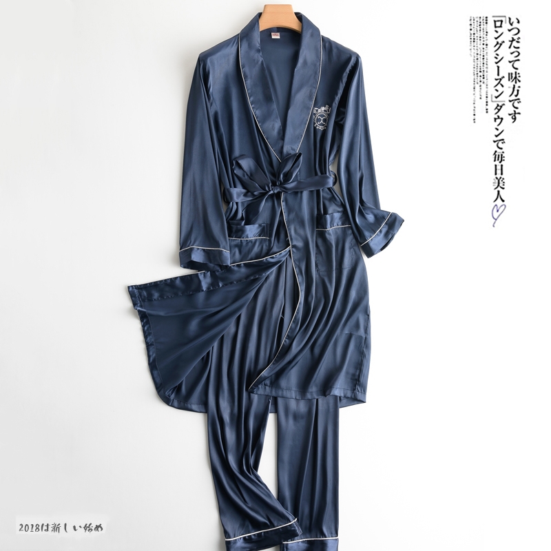 春秋男士冰丝长袖睡袍夏季薄款真丝绸睡衣中长款桑蚕丝浴袍套装