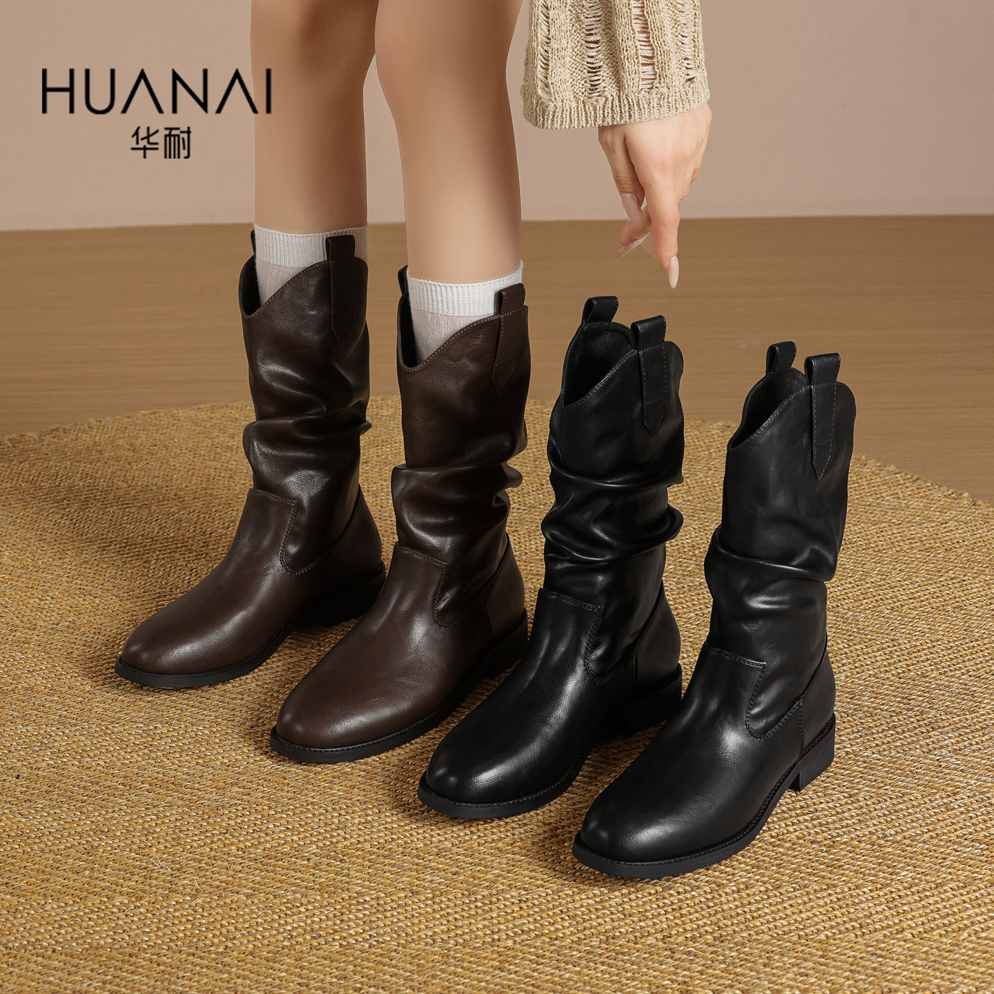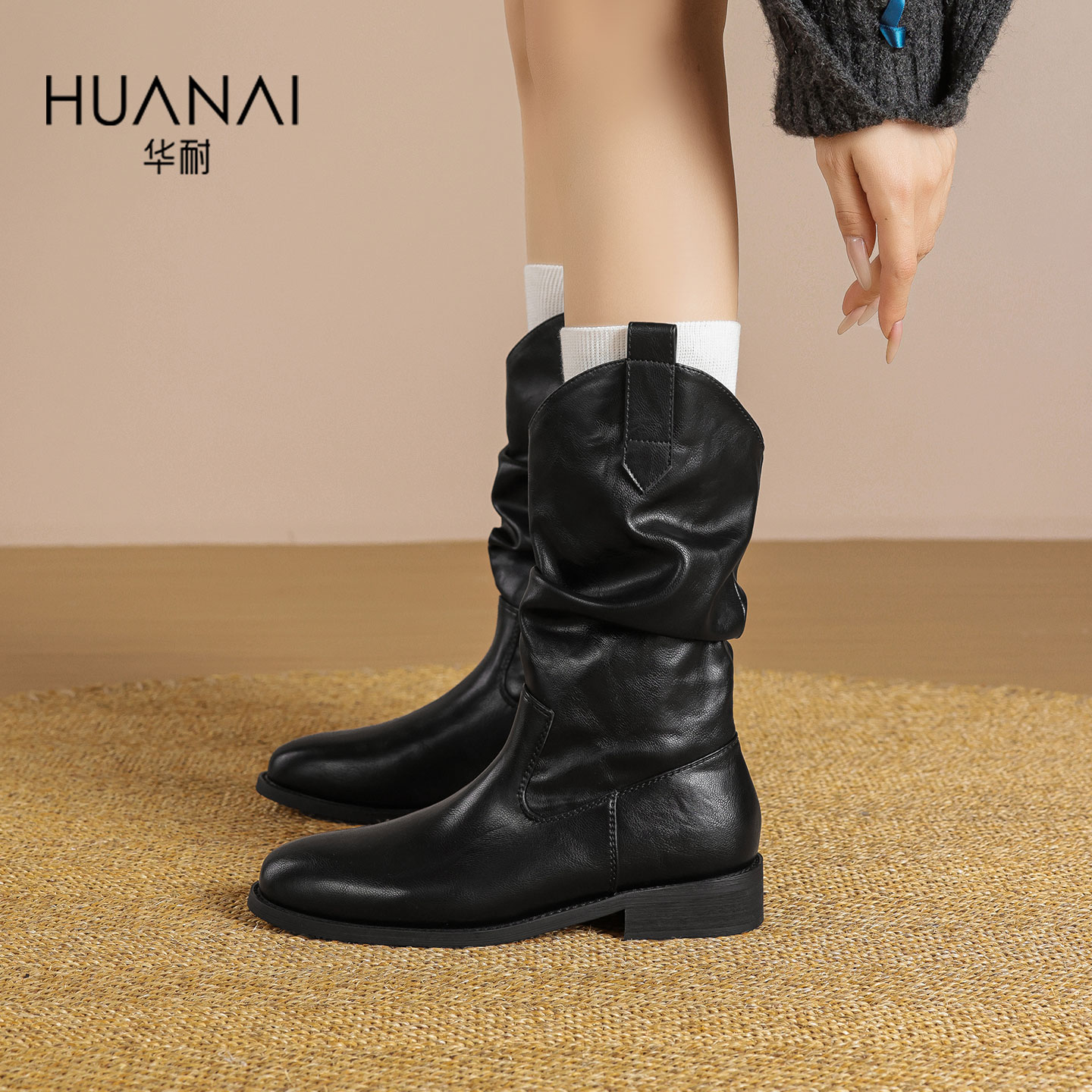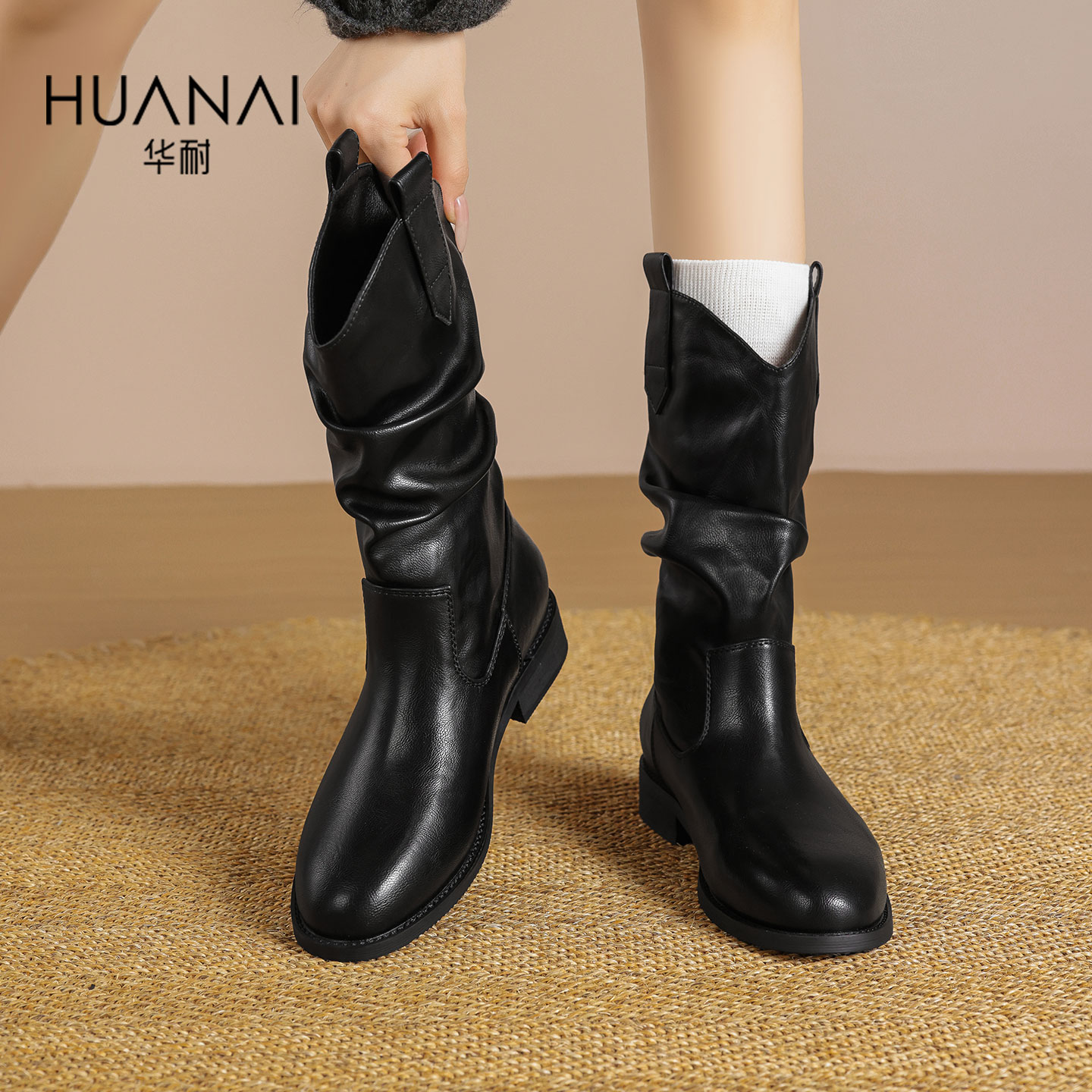 华耐褶皱中筒靴女2025秋冬新款粗跟西部骑士靴显瘦V口加绒堆堆靴