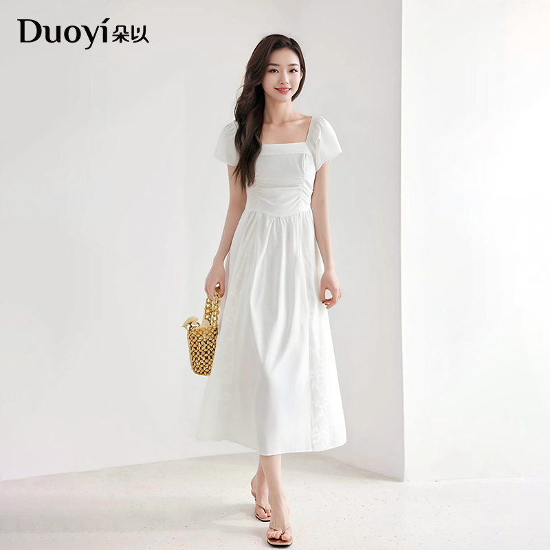 朵以2025夏季新款温柔方领拼接绣花蕾丝小飞袖连衣裙打揽小白裙
