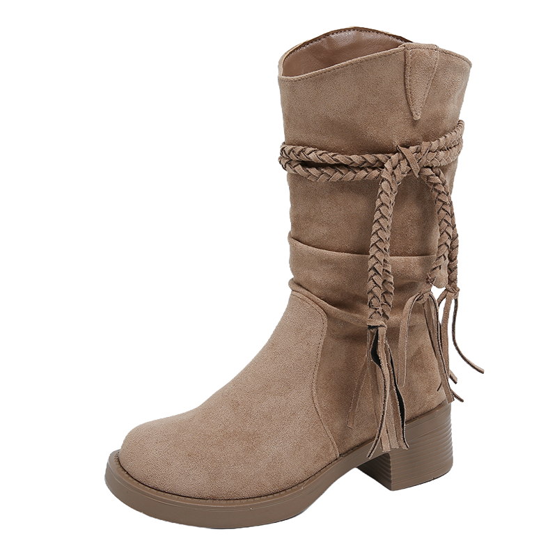大码女靴41到43胖脚宽肥美拉德流苏短靴女复古厚底粗跟中筒骑士靴