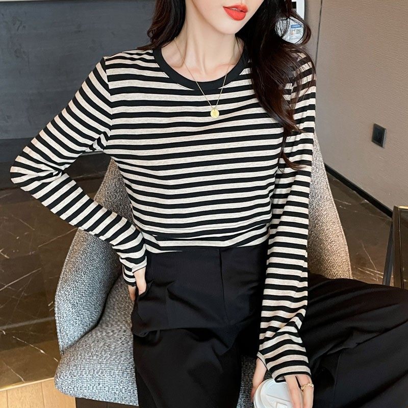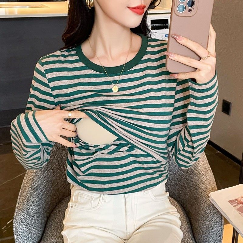 哺乳上衣纯棉条纹上掀式长袖t恤产后辣妈款外出喂奶期内搭月子服